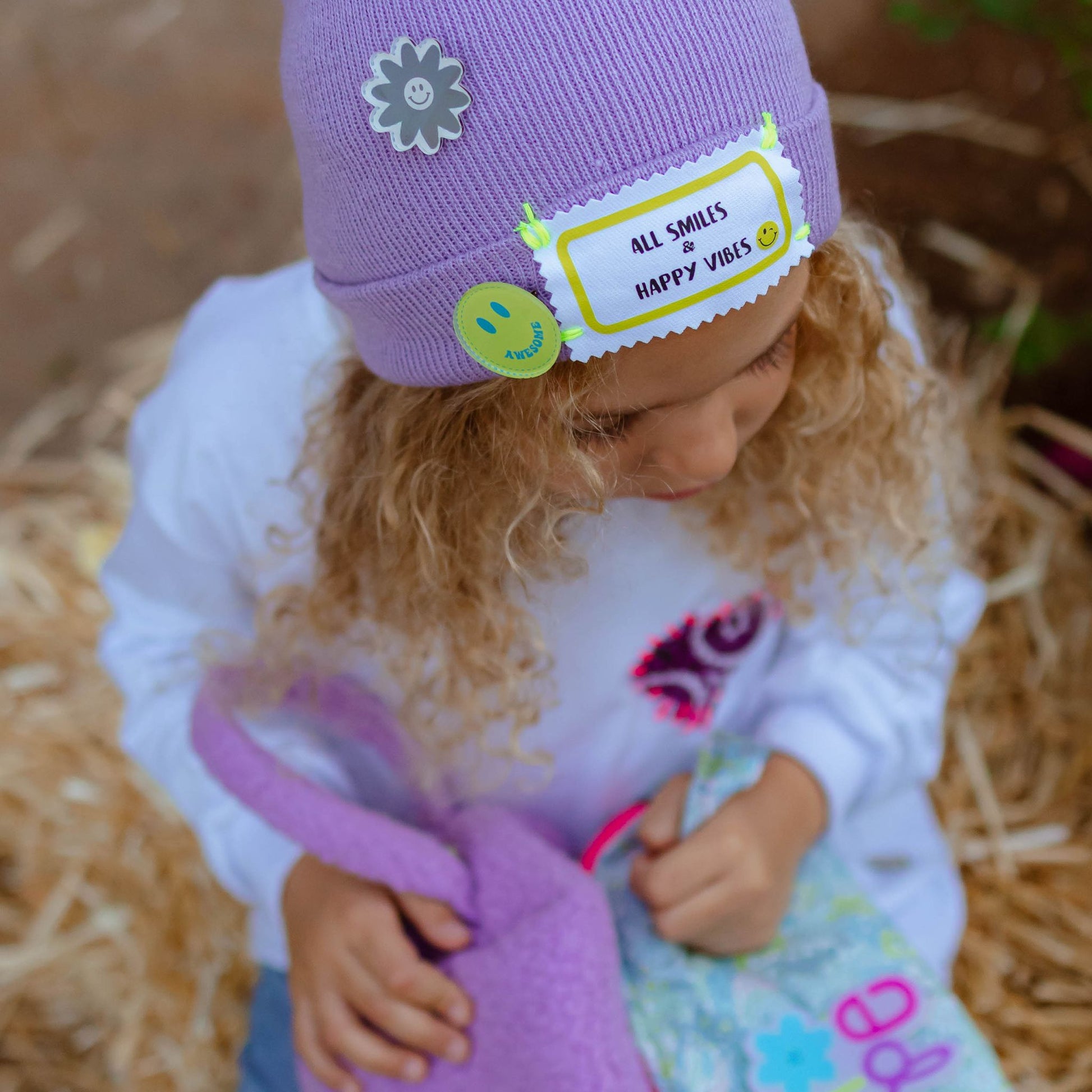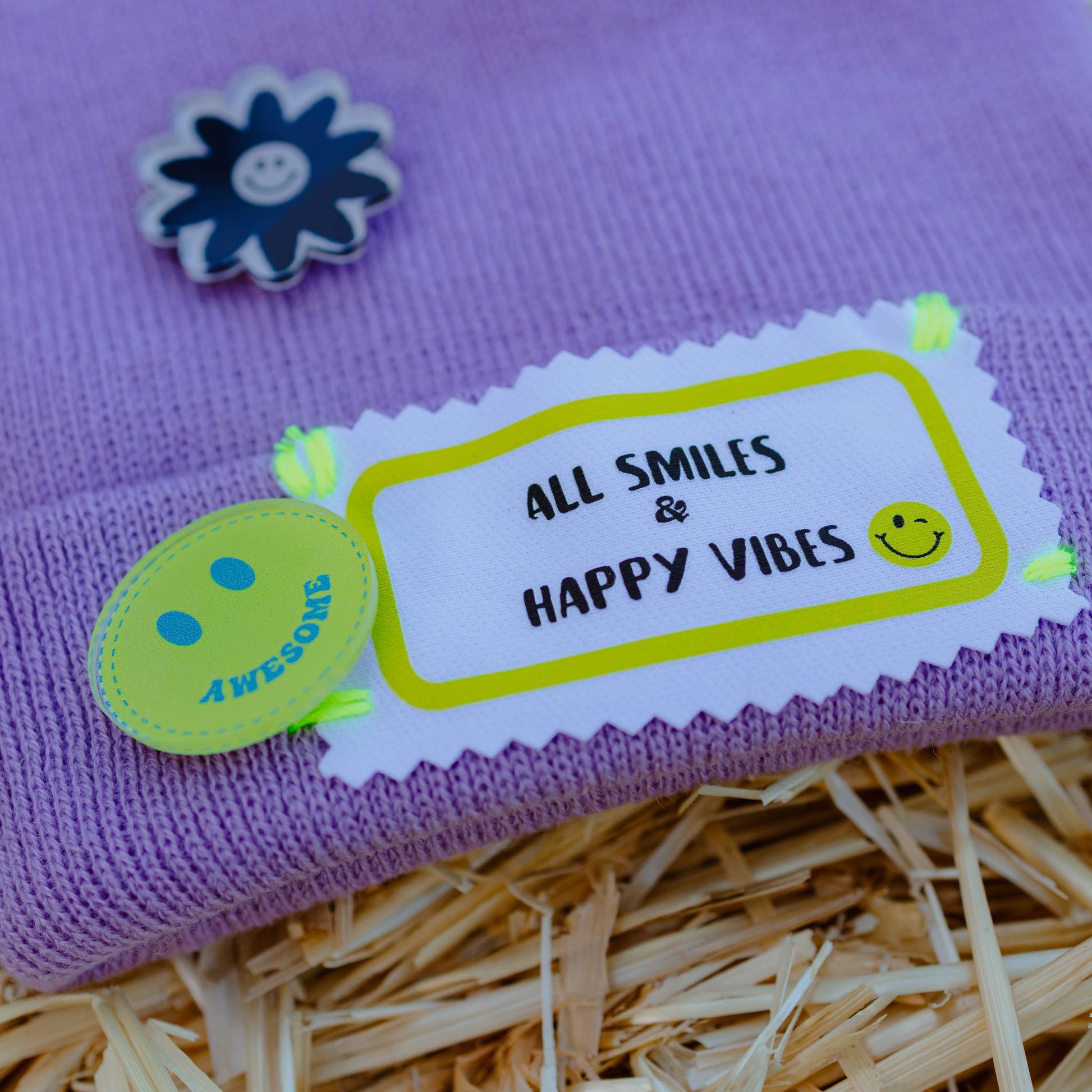 Spread positivity with the 'All Smiles & Happy Vibes' Beanie. This soft, ribbed knit hat features a custom-designed patch with the cheerful 'All Smiles & Happy Vibes' slogan. It is further accented with an adorable smiley face pin and a small flower daisy charm, enhancing its playful Y2K/Indie aesthetic.