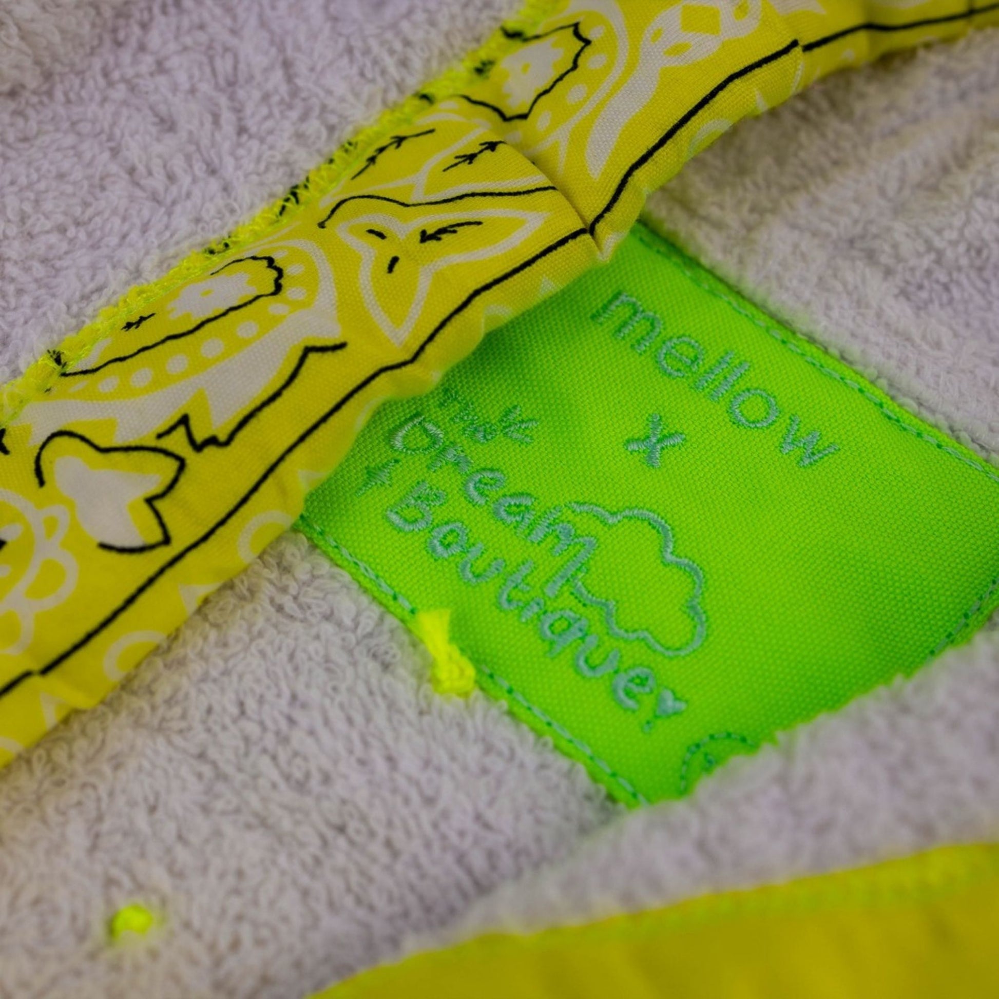 This vibrant design is expertly appliquéd and finished with striking neon yellow stitching details that add an edgy, handmade look and truly pop against the cotton terry fabric.