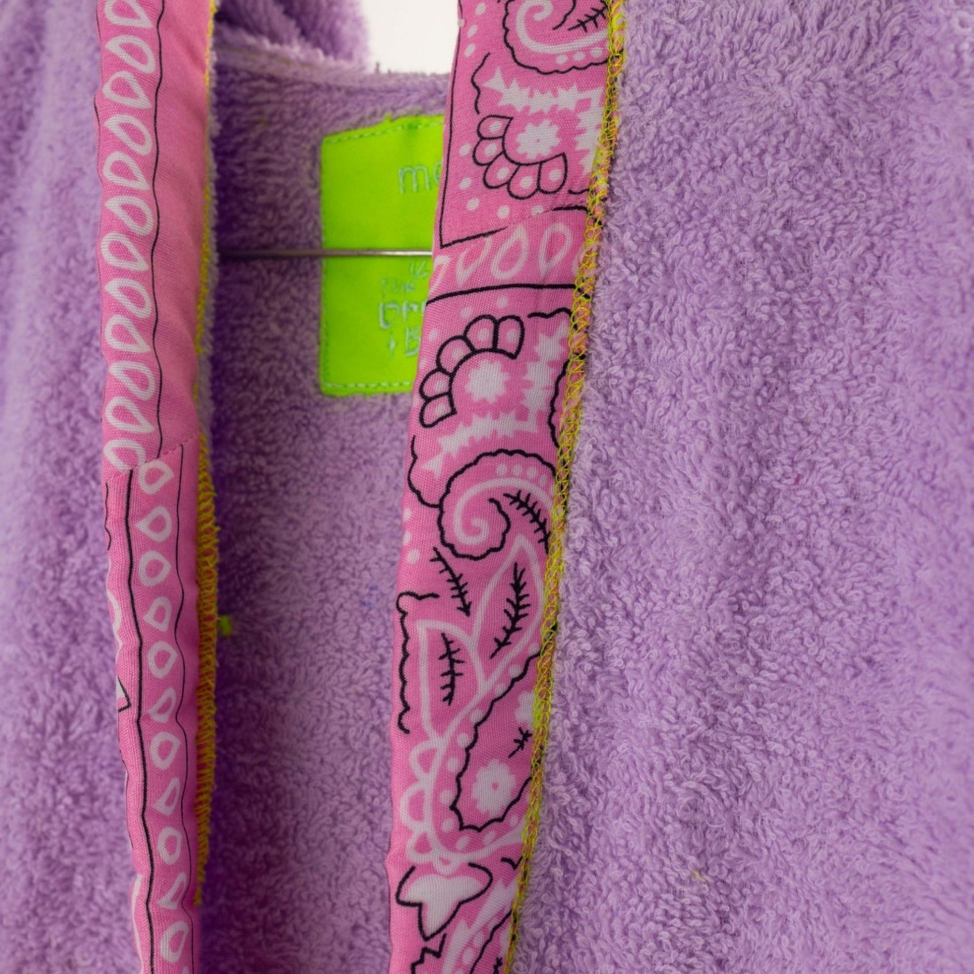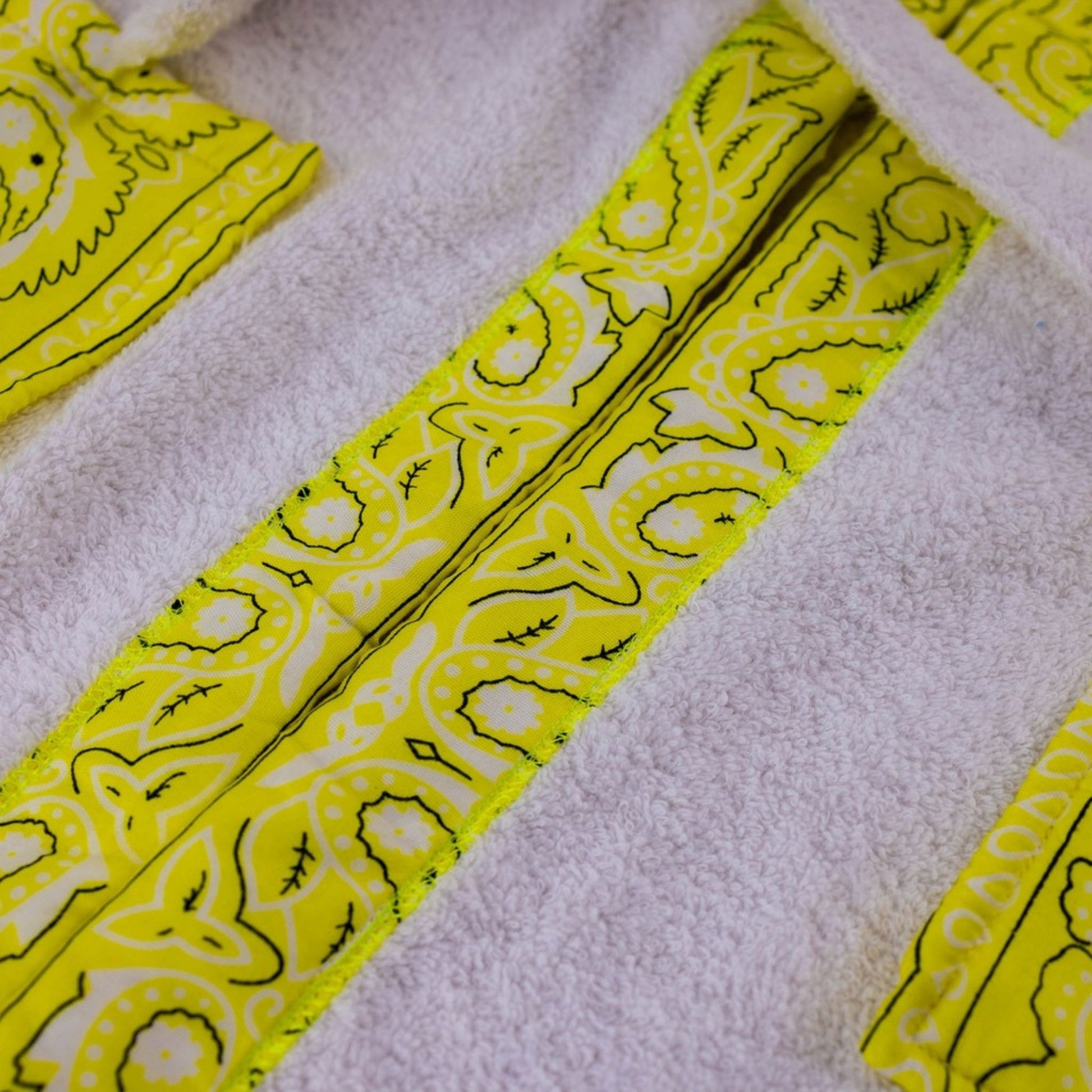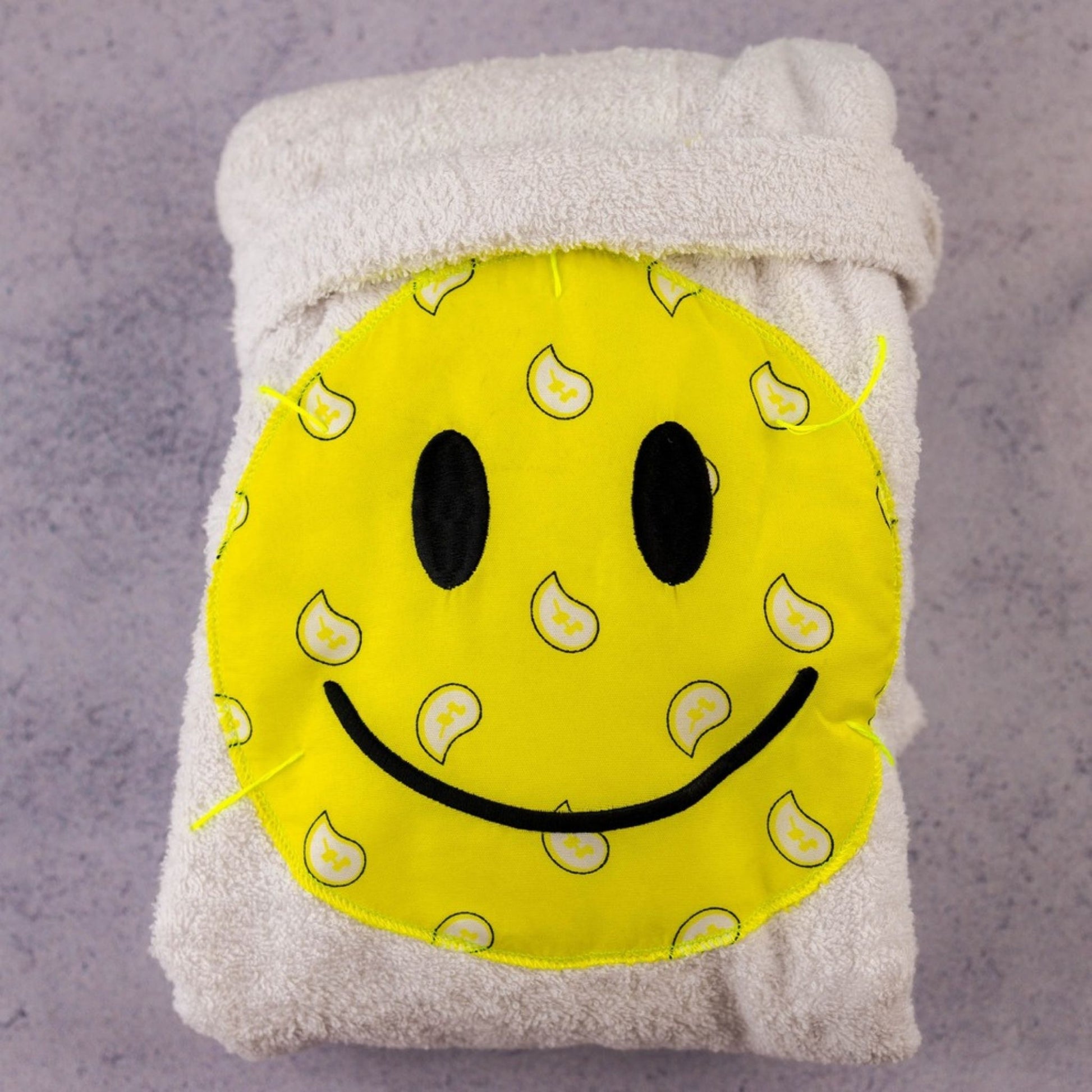 Yellow smiley face patch stitched on back of white cotton kids bathrobe