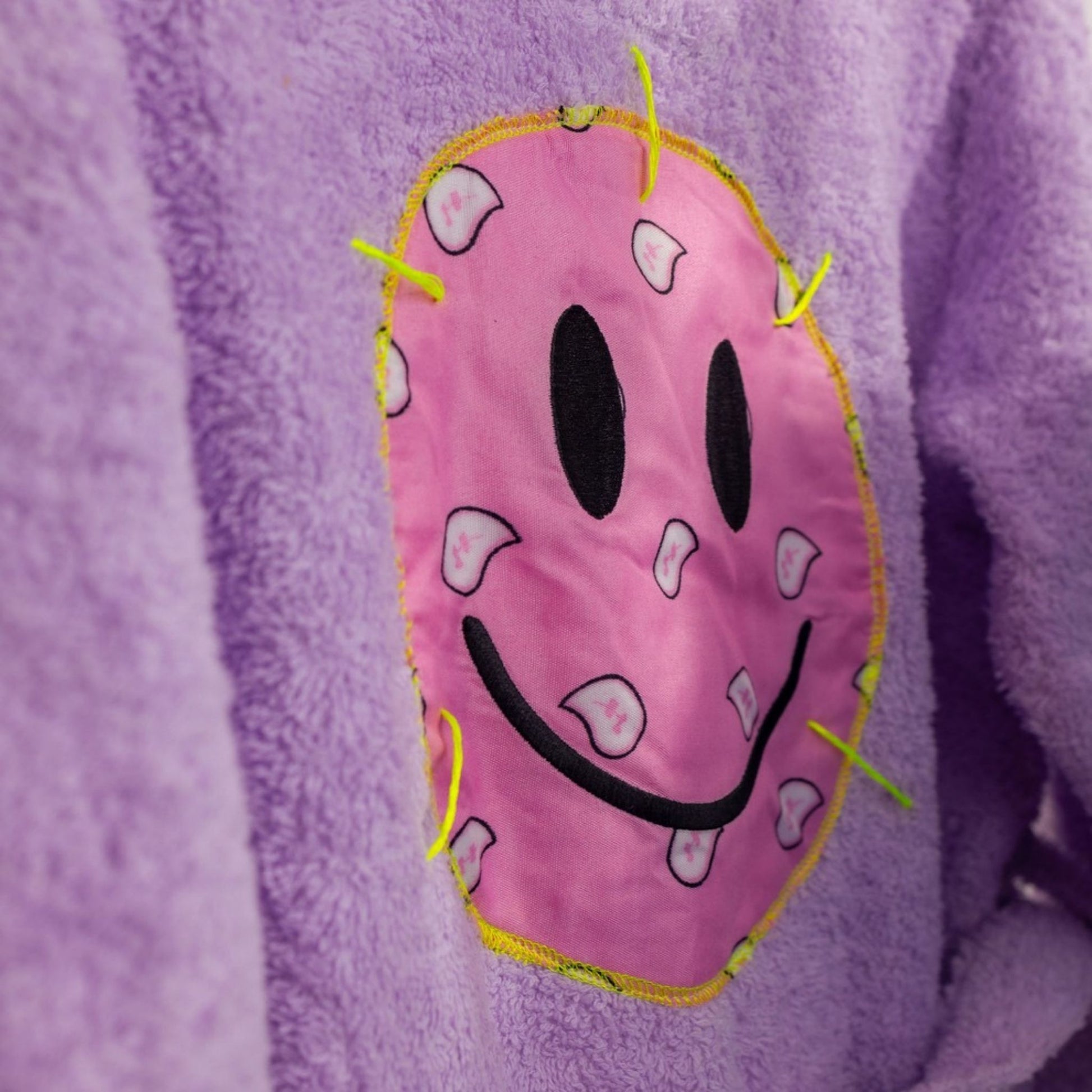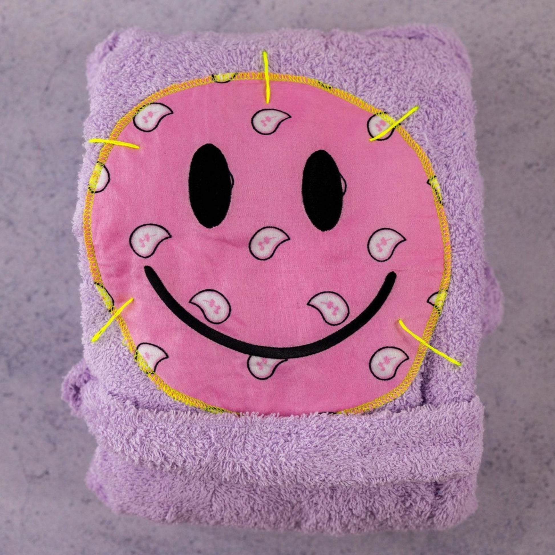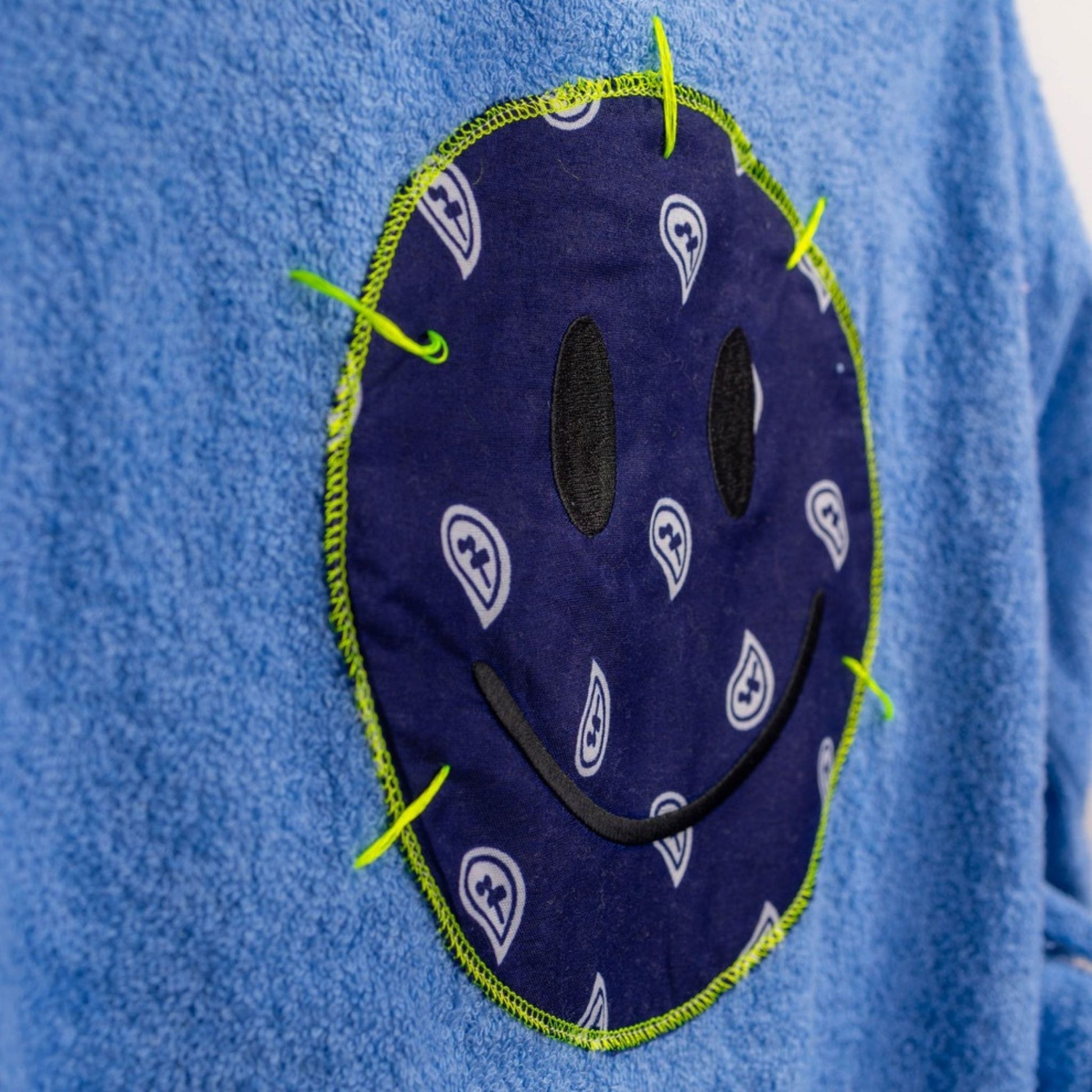 The oversized hood and relaxed fit make it the perfect cover-up after a swim, a comfortable choice for lounging at a festival, or a fun addition to your bathroom routine. The defining feature is the bold, circular smiley face patch showcasing a cool bandana print.