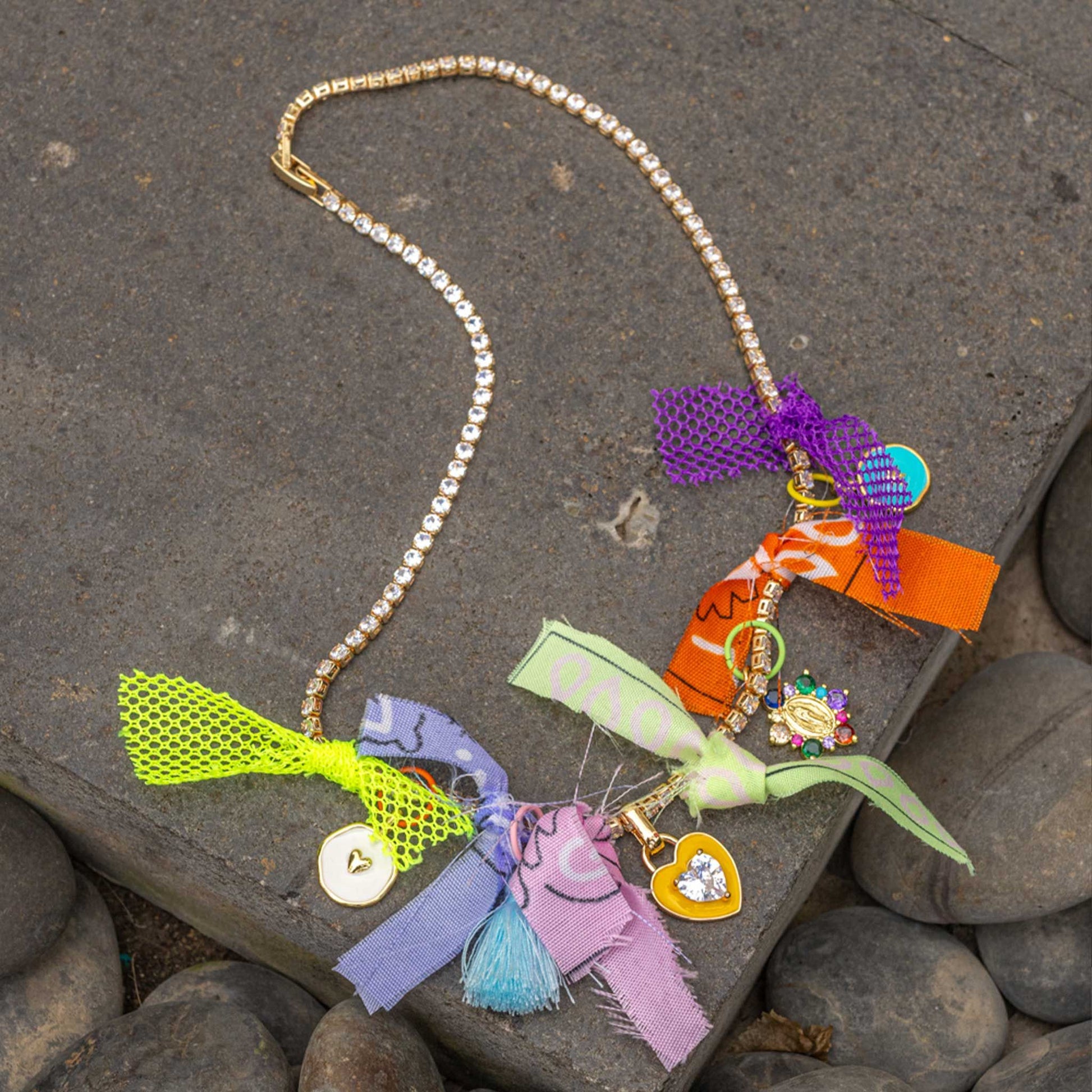 Studded chain necklace accented with gold plated charms, colorful bandana strips, and ribbons. A lively mix of textures and shades that adds playful charm to any look.