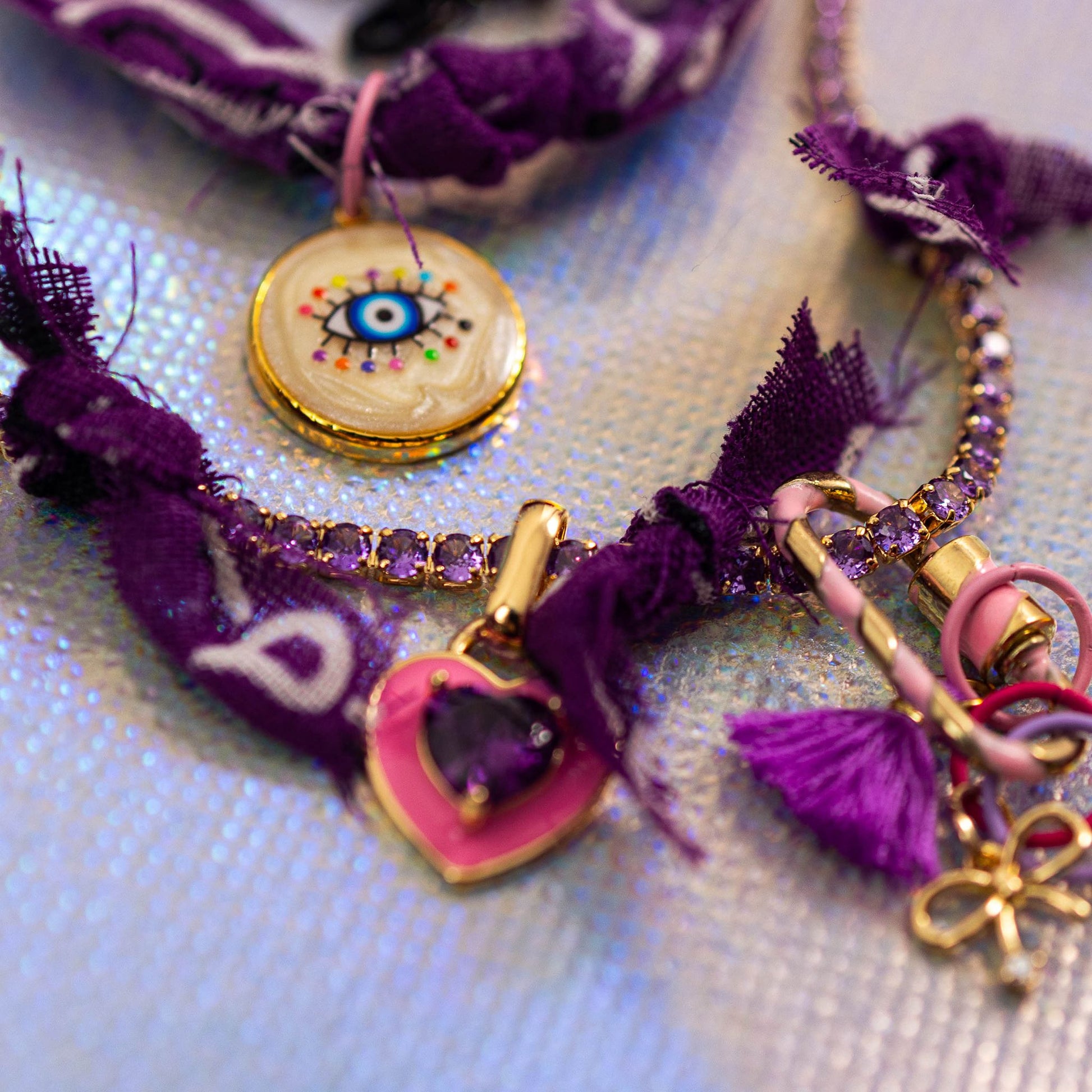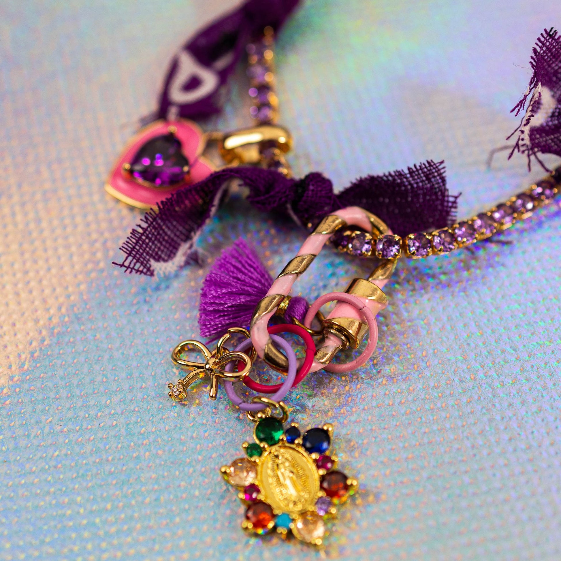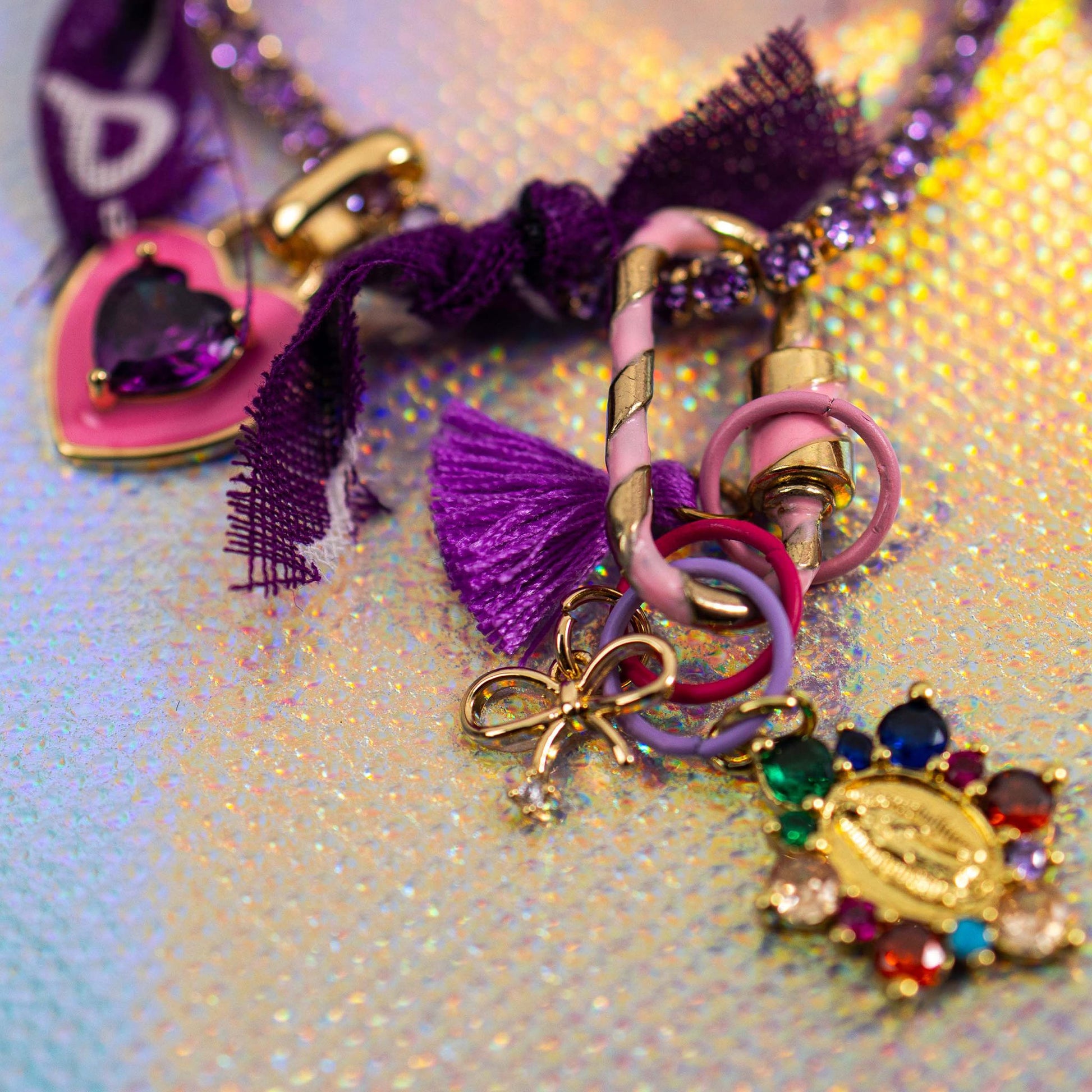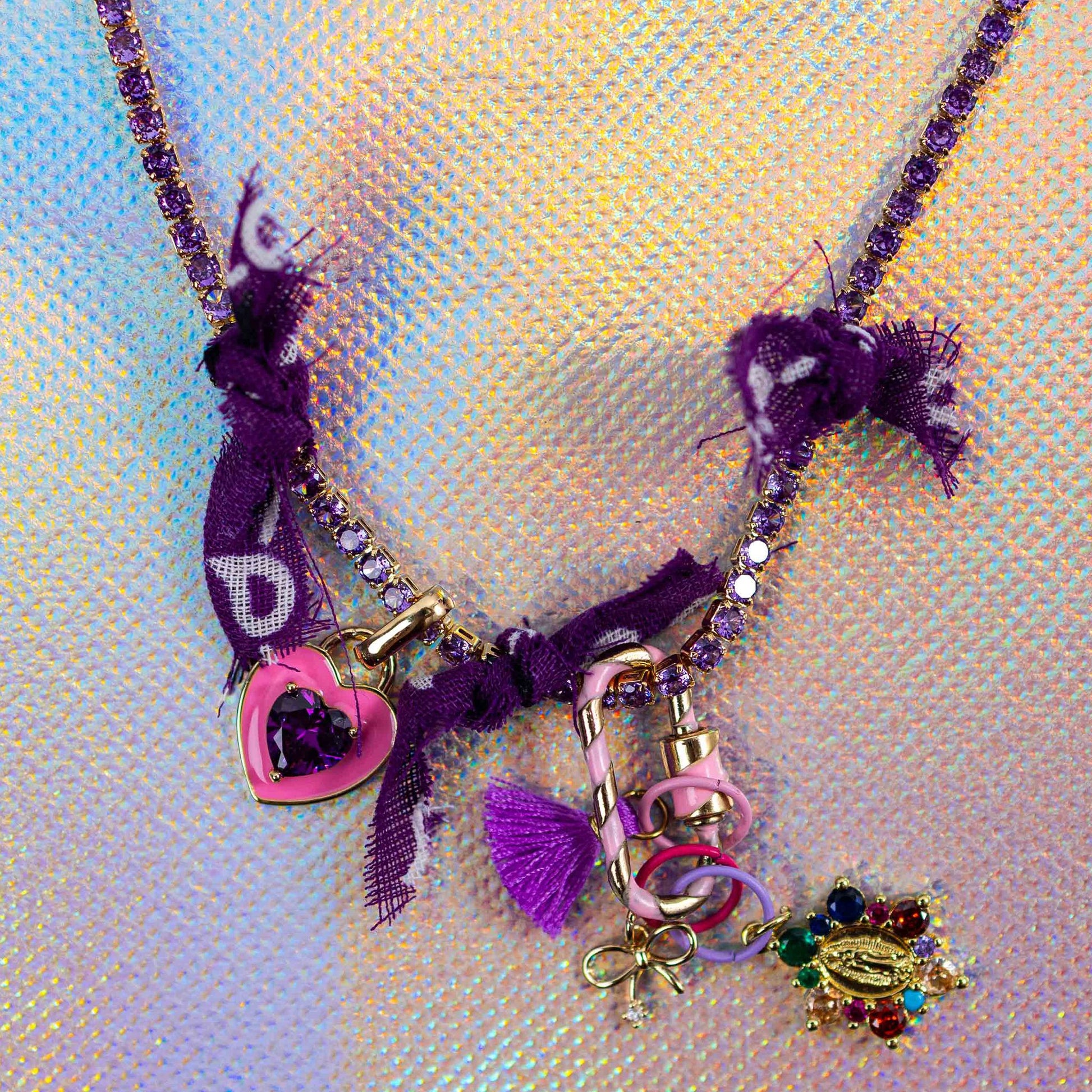 Add a pop of color and attitude with the Charmed Studs Necklace, a vibrant statement piece inspired by Y2K street style. The chain shimmers with purple stones and is wrapped in soft bandana ribbons for a playful, textured look. Finished with gold-tone charms, colorful rings, and eye-catching details like heart and bow pendants, this unisex necklace brings bold energy and a nostalgic edge to any outfit.