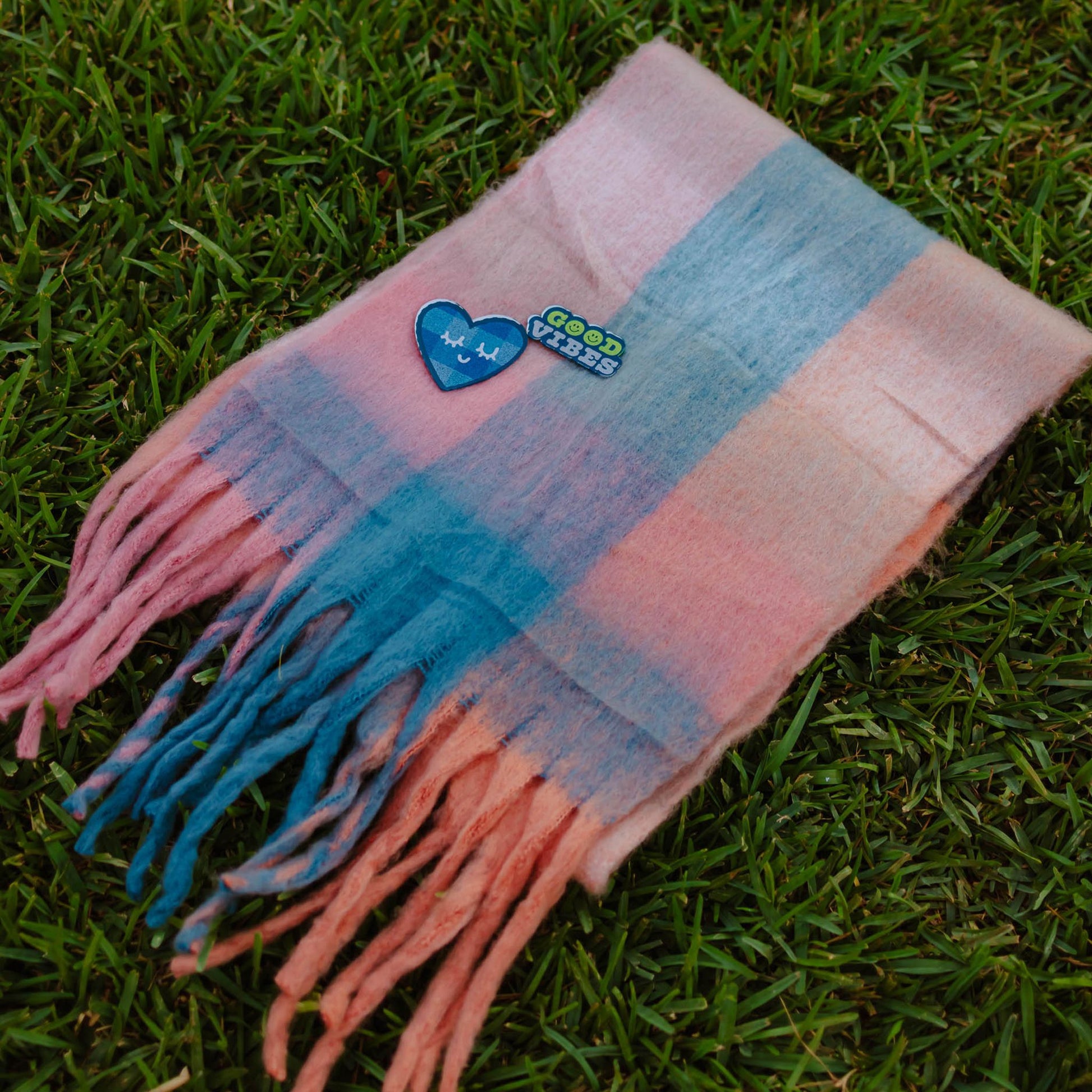 Add colour and positivity to your look with the Checkered Good Vibes Scarf in Peach & Denim Blue. This soft, lightweight scarf features a trendy check pattern and comes styled with two cheerful decorative pins - a heart face and “Good Vibes” slogan.