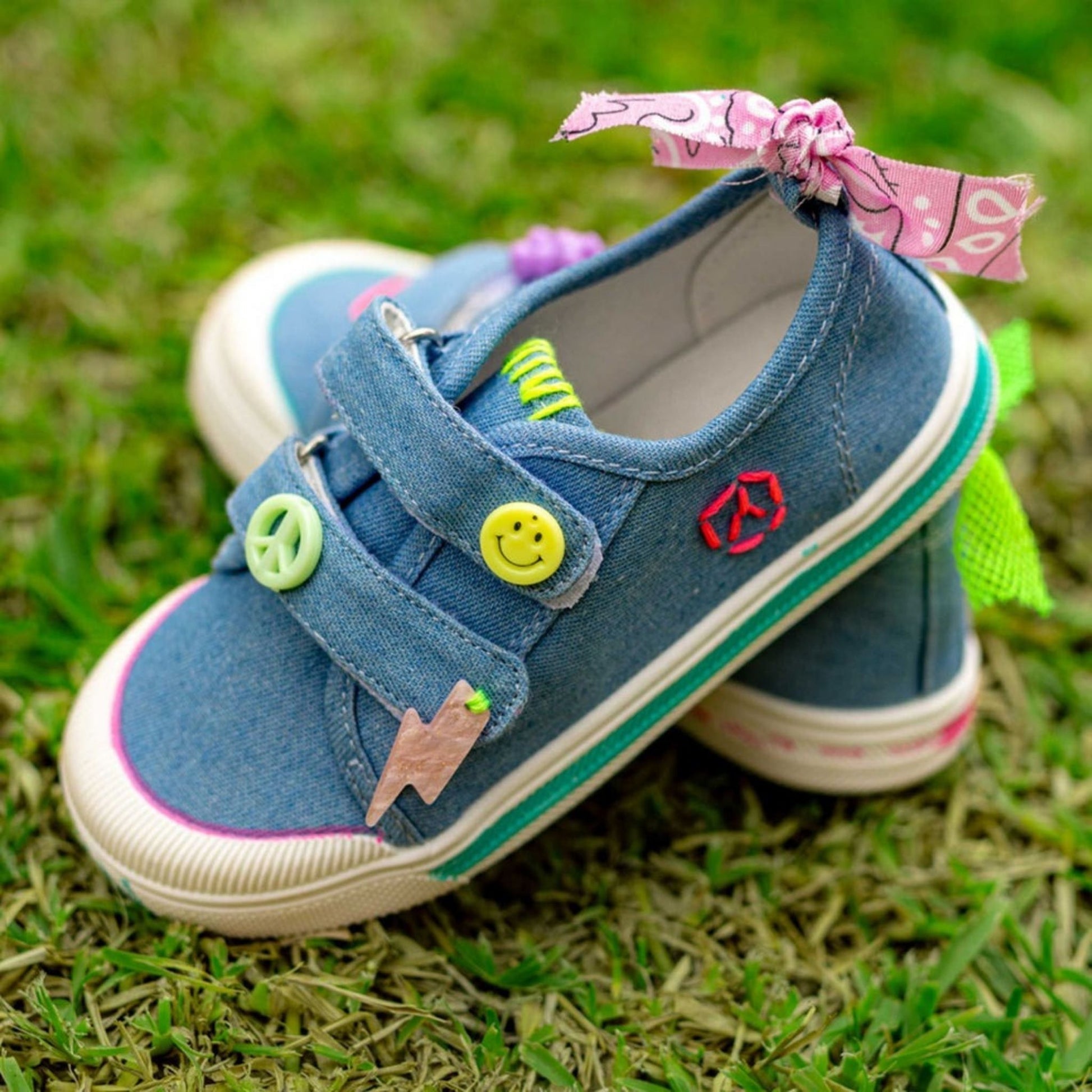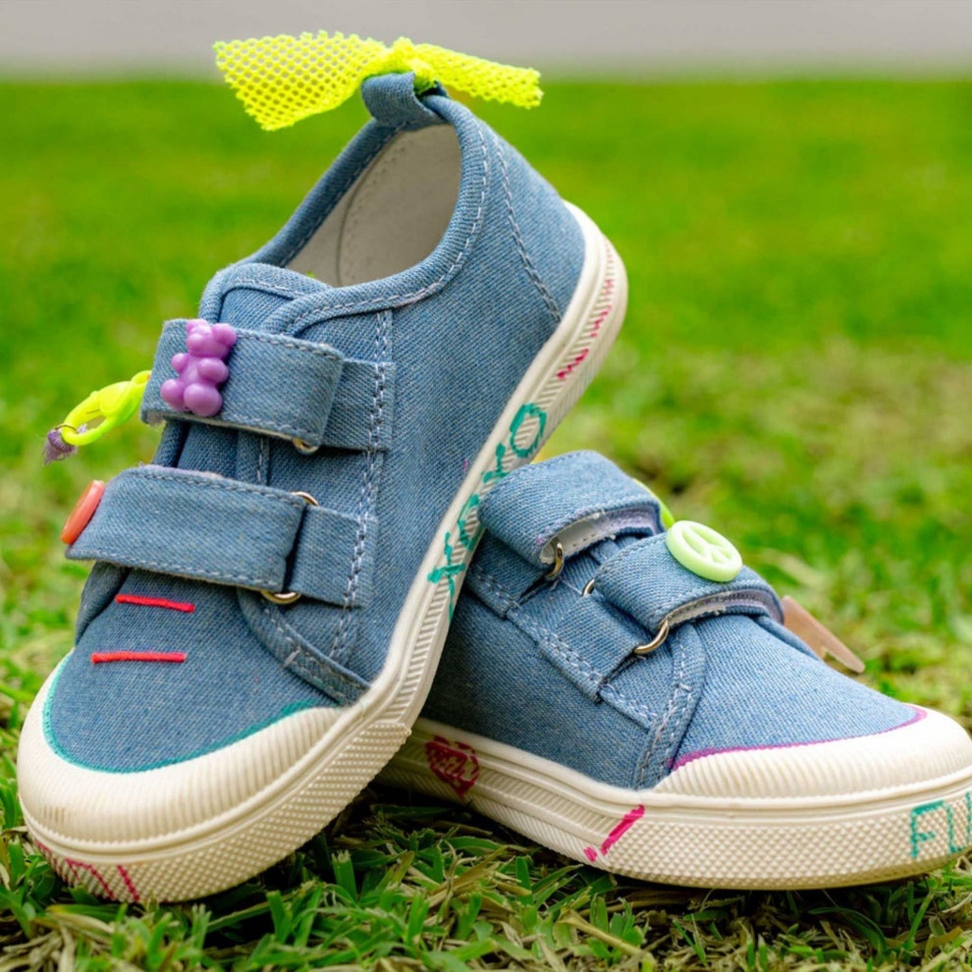 Step into fun with these Cool Girls Denim Sneakers, custom-designed for playful hearts and creative souls. Made from soft denim, these sneakers feature vibrant hand-stitched details, colorful buttons, beads, charms, and quirky lace embellishments.