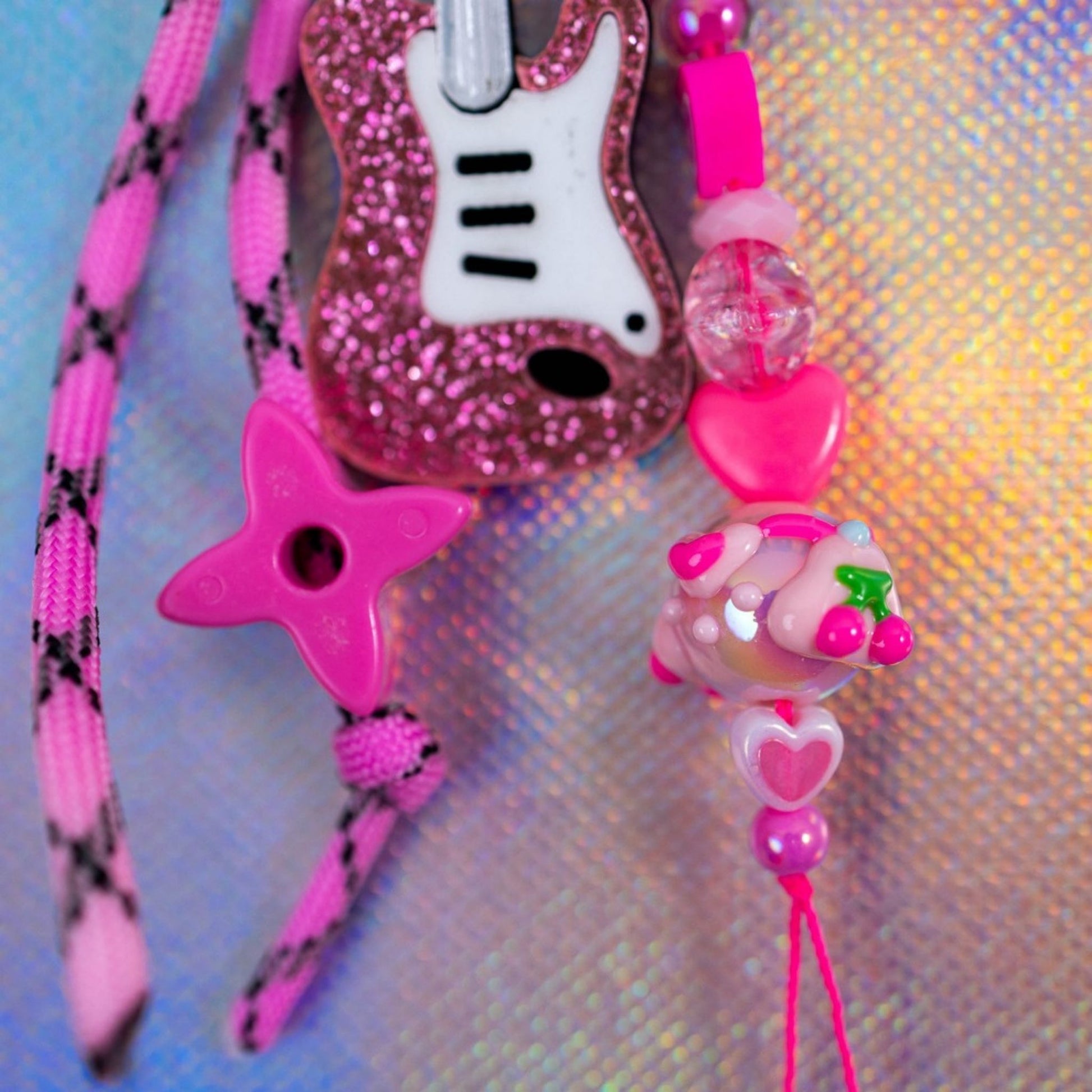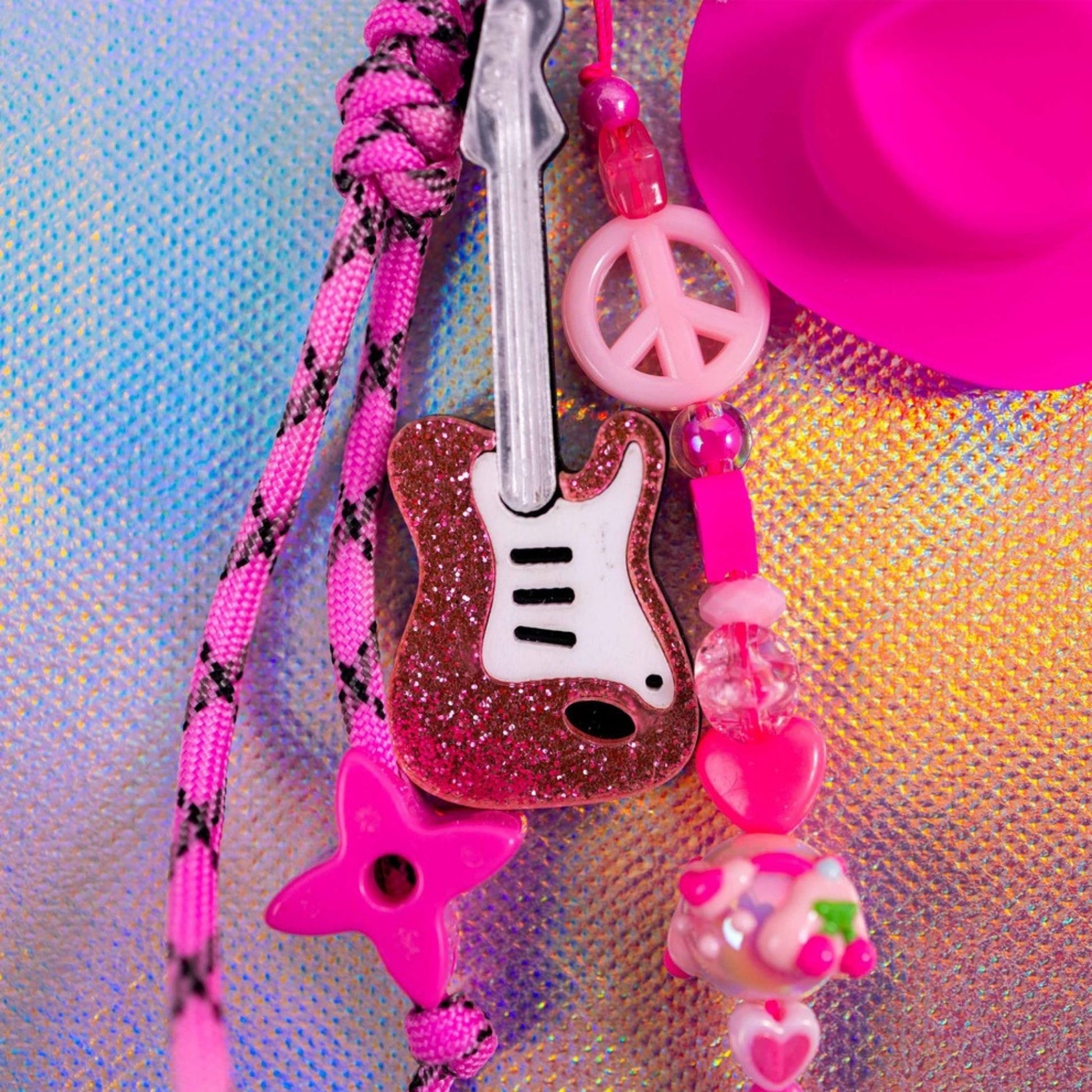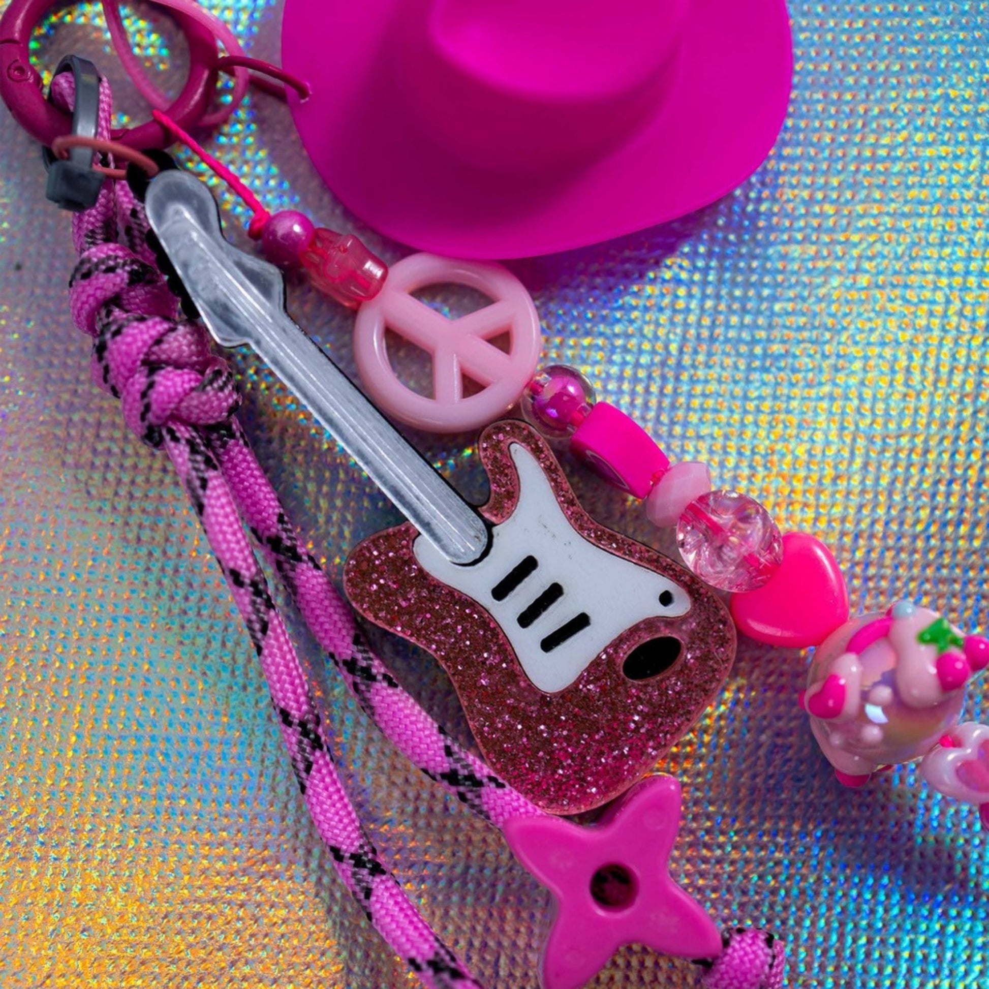 Step into the spotlight with this fiercely pink Y2K Cowgirl-themed Key Charm! This accessory is the perfect blend of playful pop-punk and Western flair. The charm features a dazzling pink glitter electric guitar, a coordinating bright pink cowboy hat, and a chunky paracord strap. Other fun details include a peace sign charm, star beads, and various heart beads, giving it a nostalgic, early 2000s vibe.
