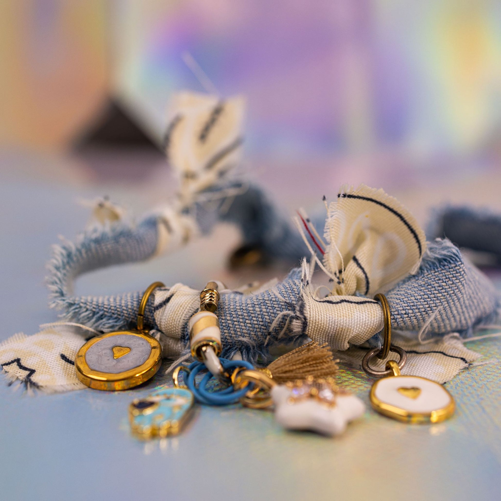 - Eclectic Charms: The design features a collection of charms, including a star charm and a vibrant blue eye charm that capture the expressive Y2K/Indie aesthetic