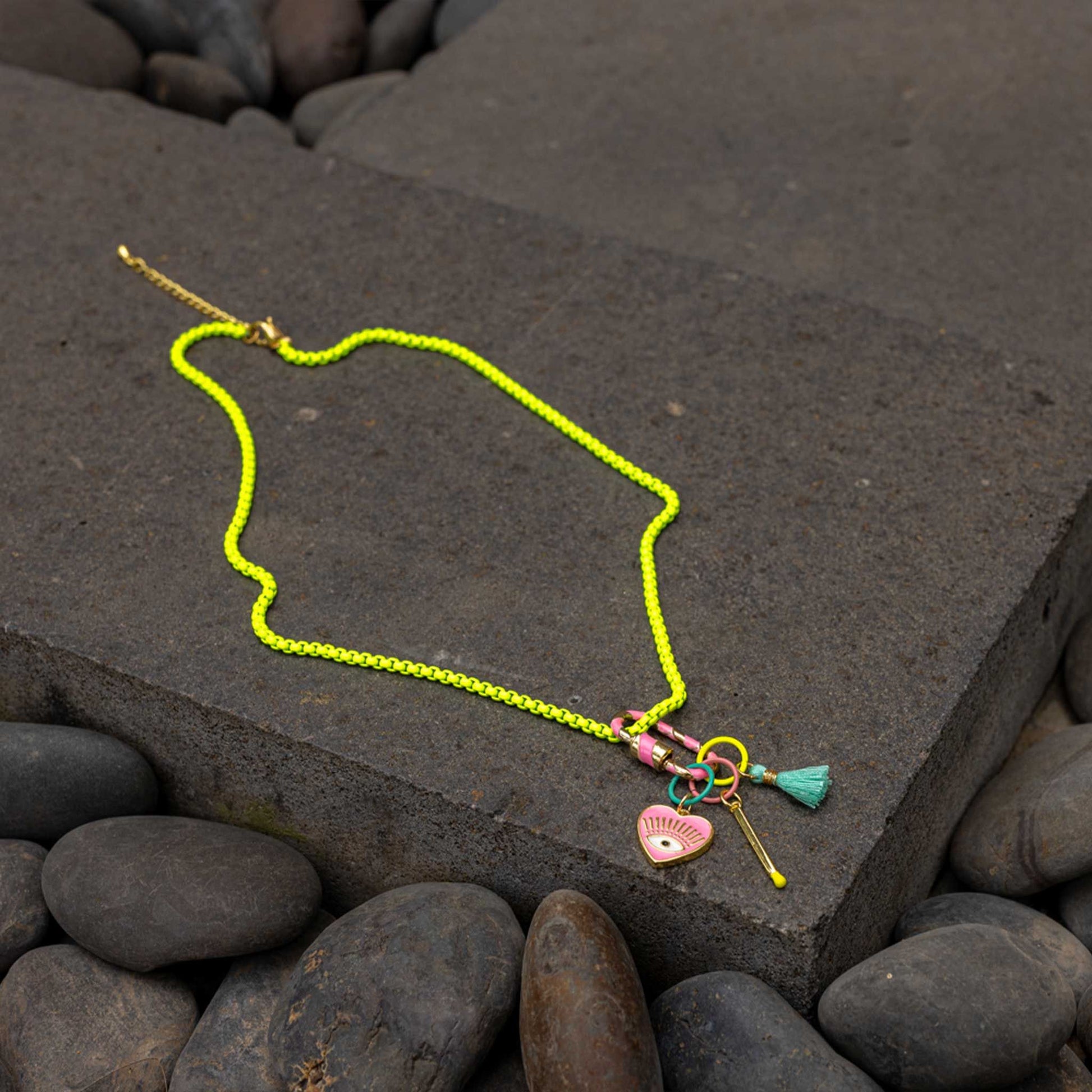 A playful neon chain necklace adorned with gold-plated charms, including an eye heart pendant, tassel, and more. Adds a pop of color and charm to any casual look.