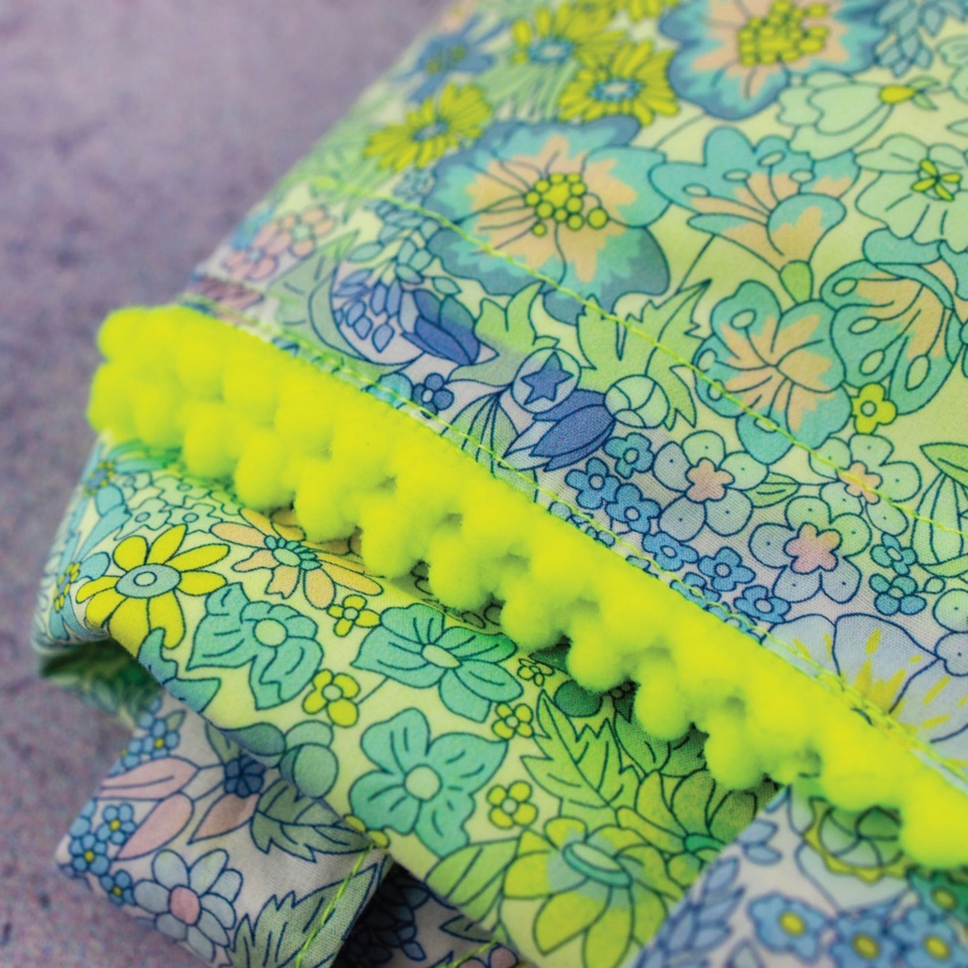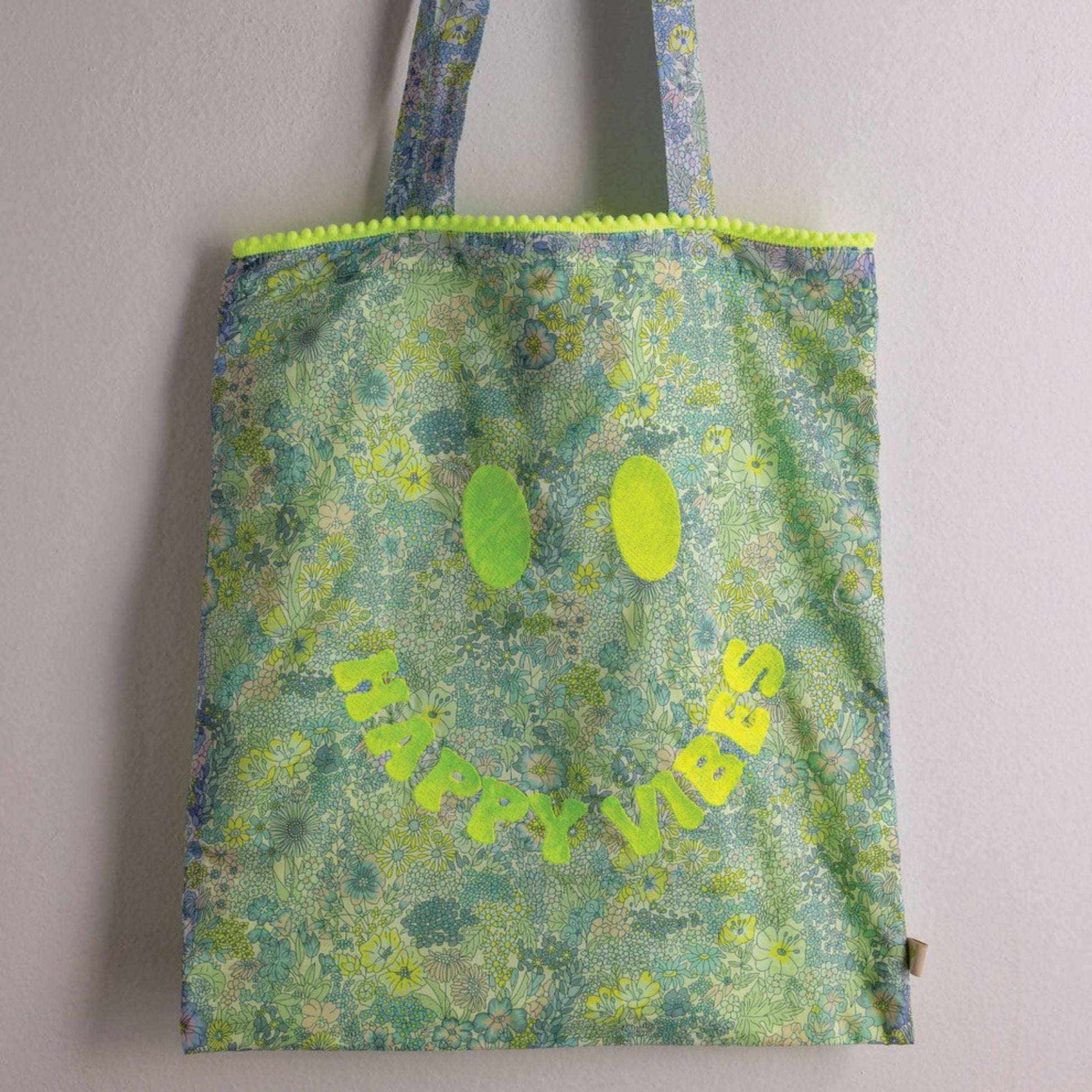 Carry your essentials and spread good cheer with our Floral "Happy Vibes" Tote Bag! This stylish, durable shoulder bag features a charming ditsy floral print in spring colors, contrasted by a bold, neon yellow "Happy Vibes" smiley graphic. It's finished with a playful neon pom-pom trim for a fun, Y2K aesthetic.