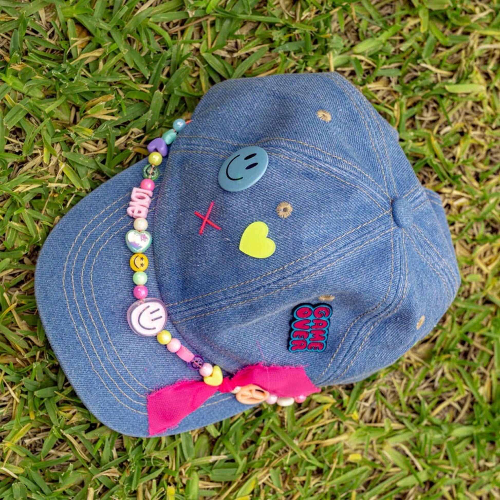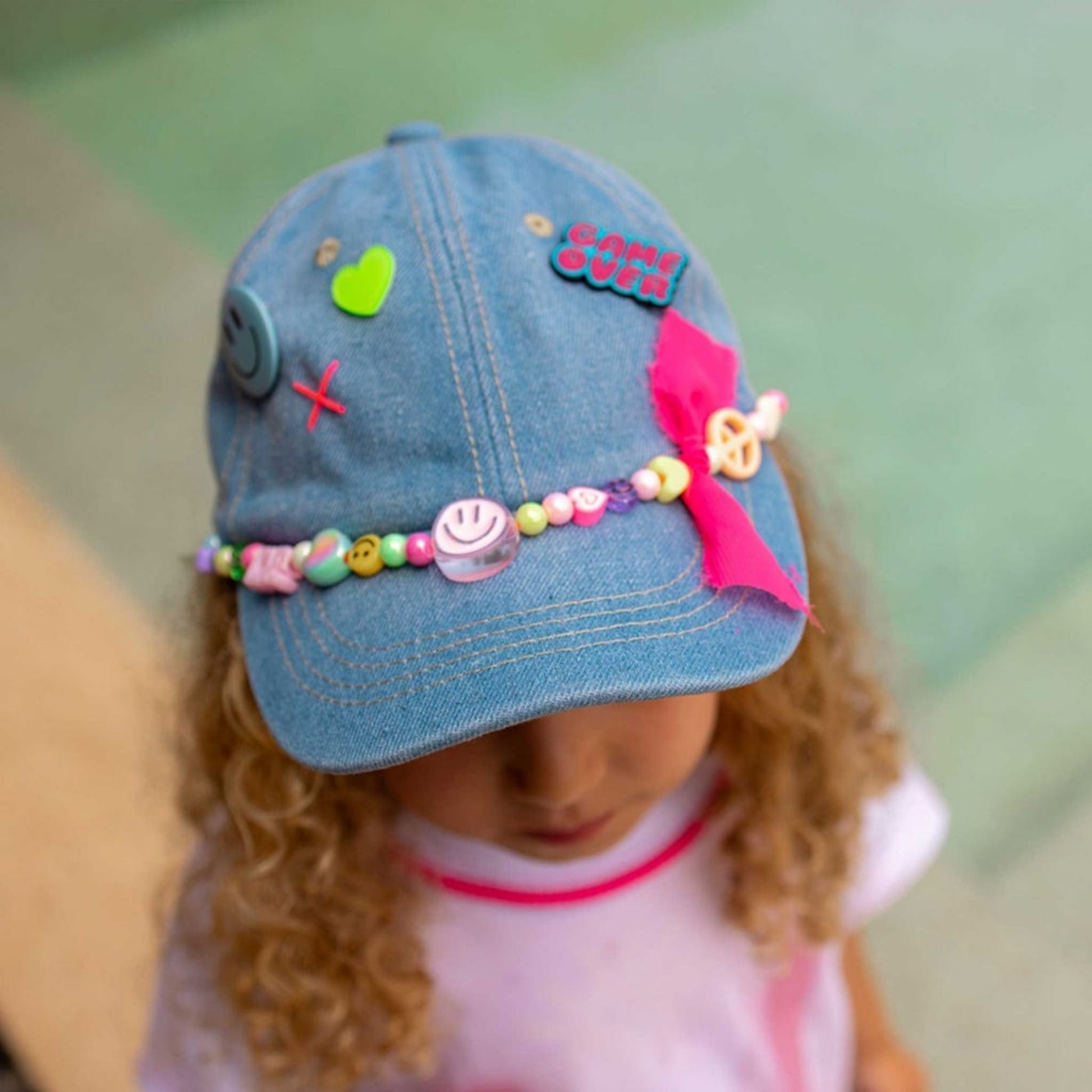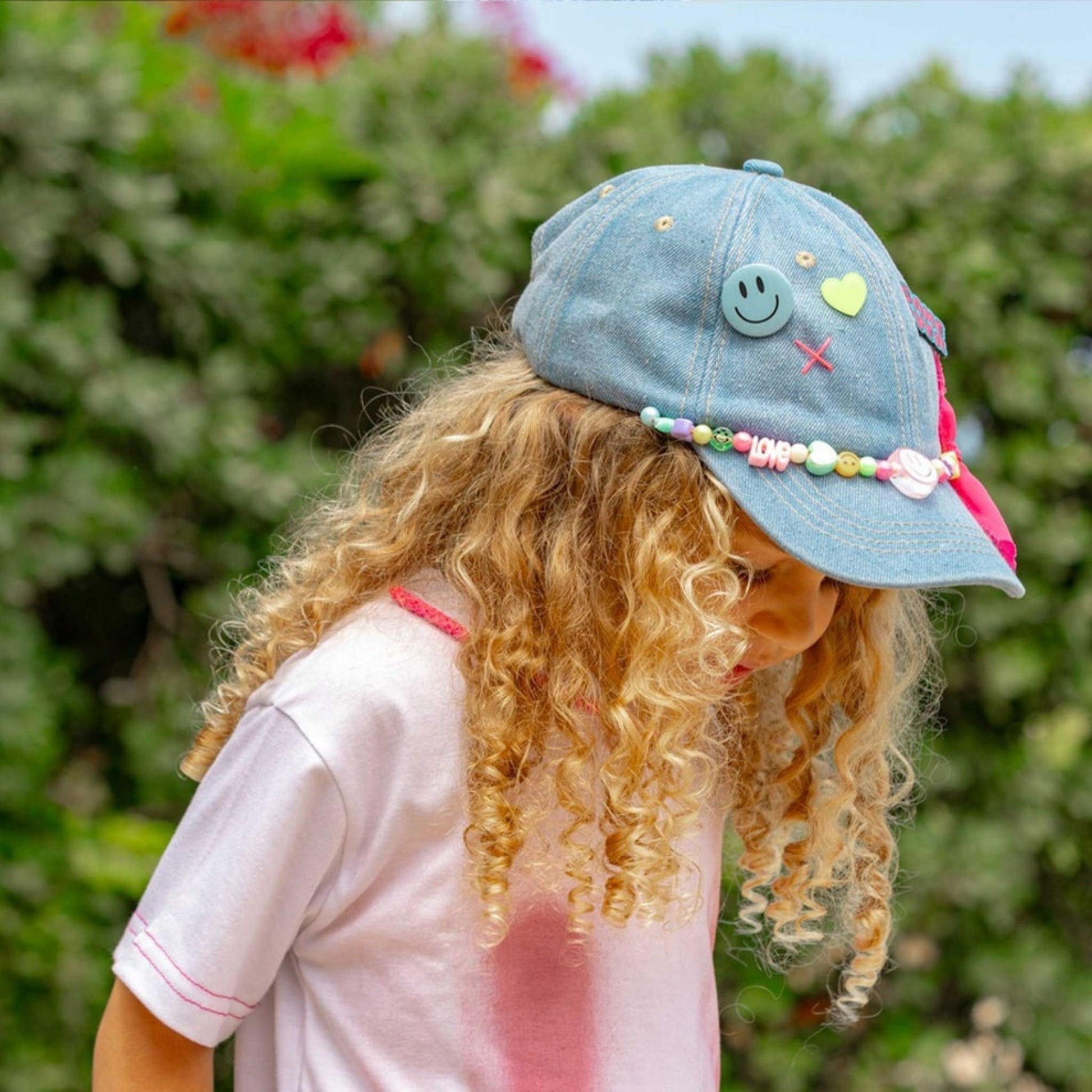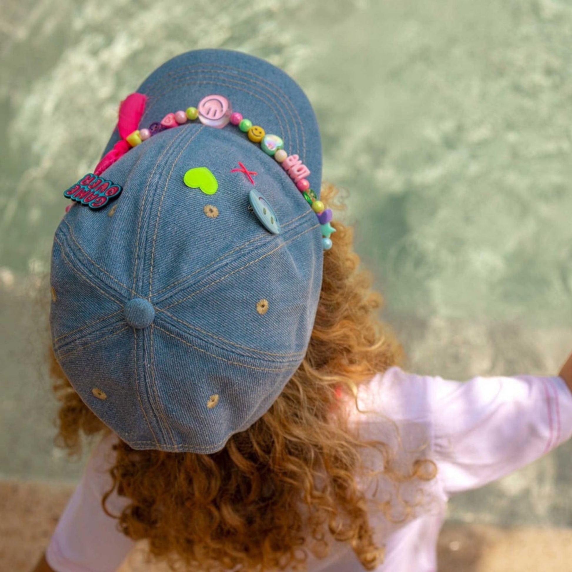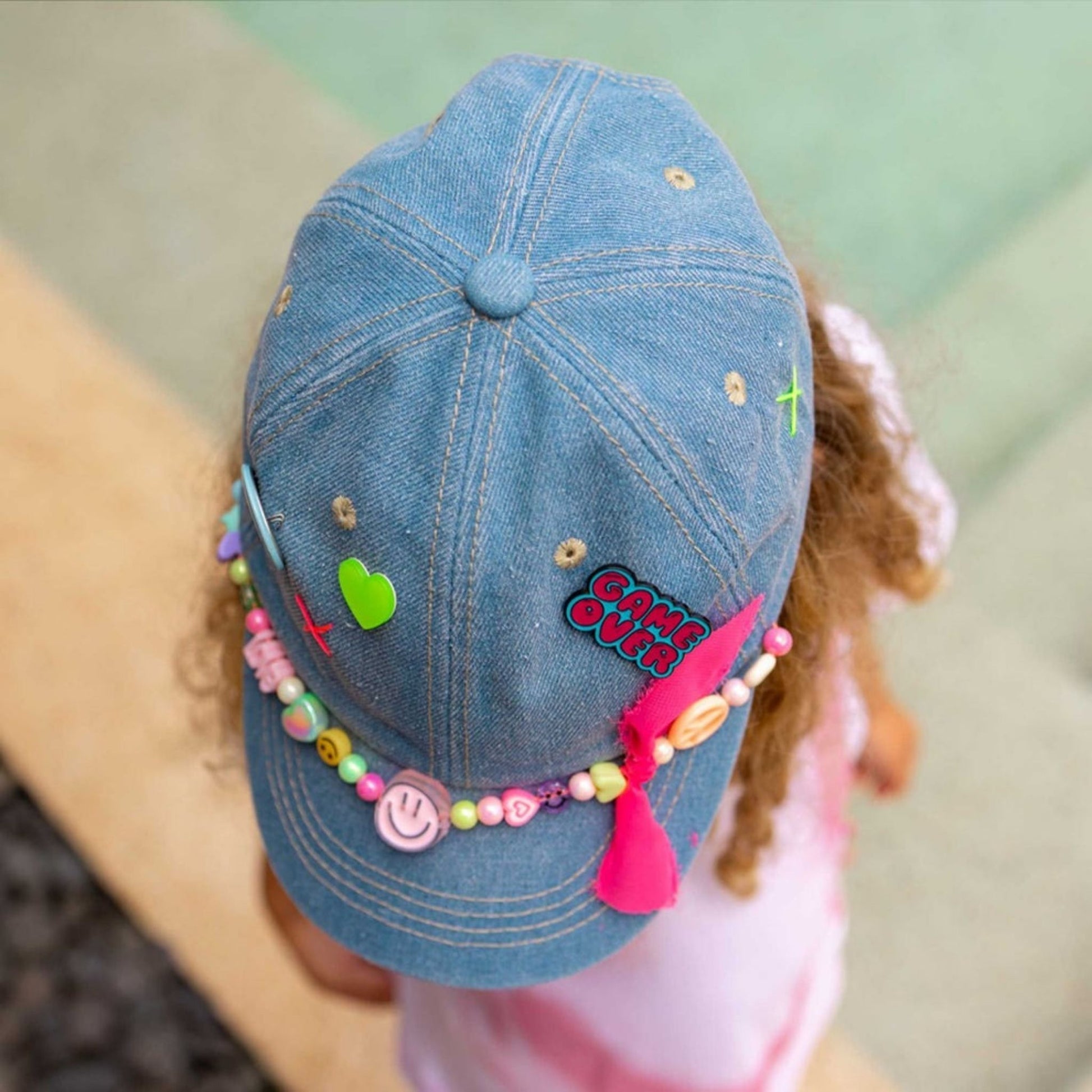A fun denim cap crafted for girls who love style and creativity! Features hand-stitched embroidery, bright pins, and colorful beaded charms. Perfect for a unique look and fits ages 3-8. Perfect for sunny adventures and playful days.