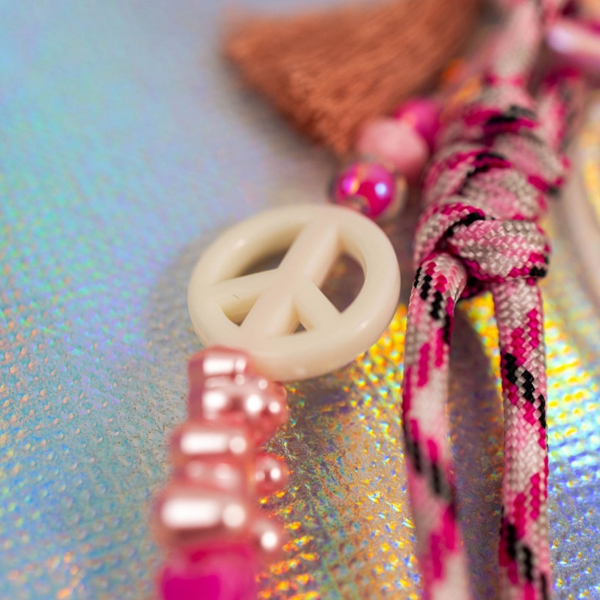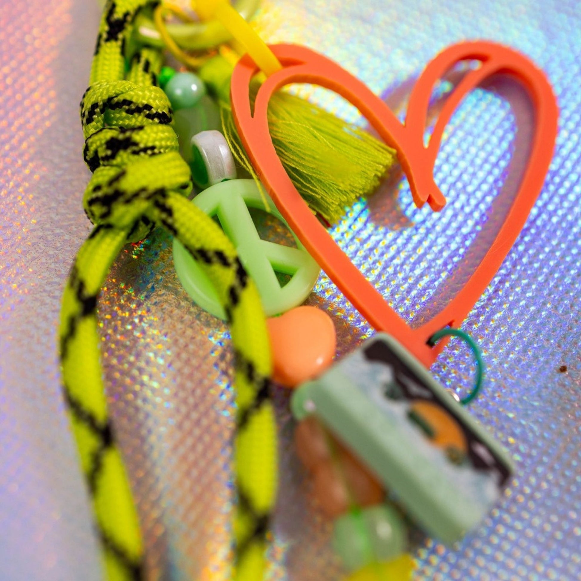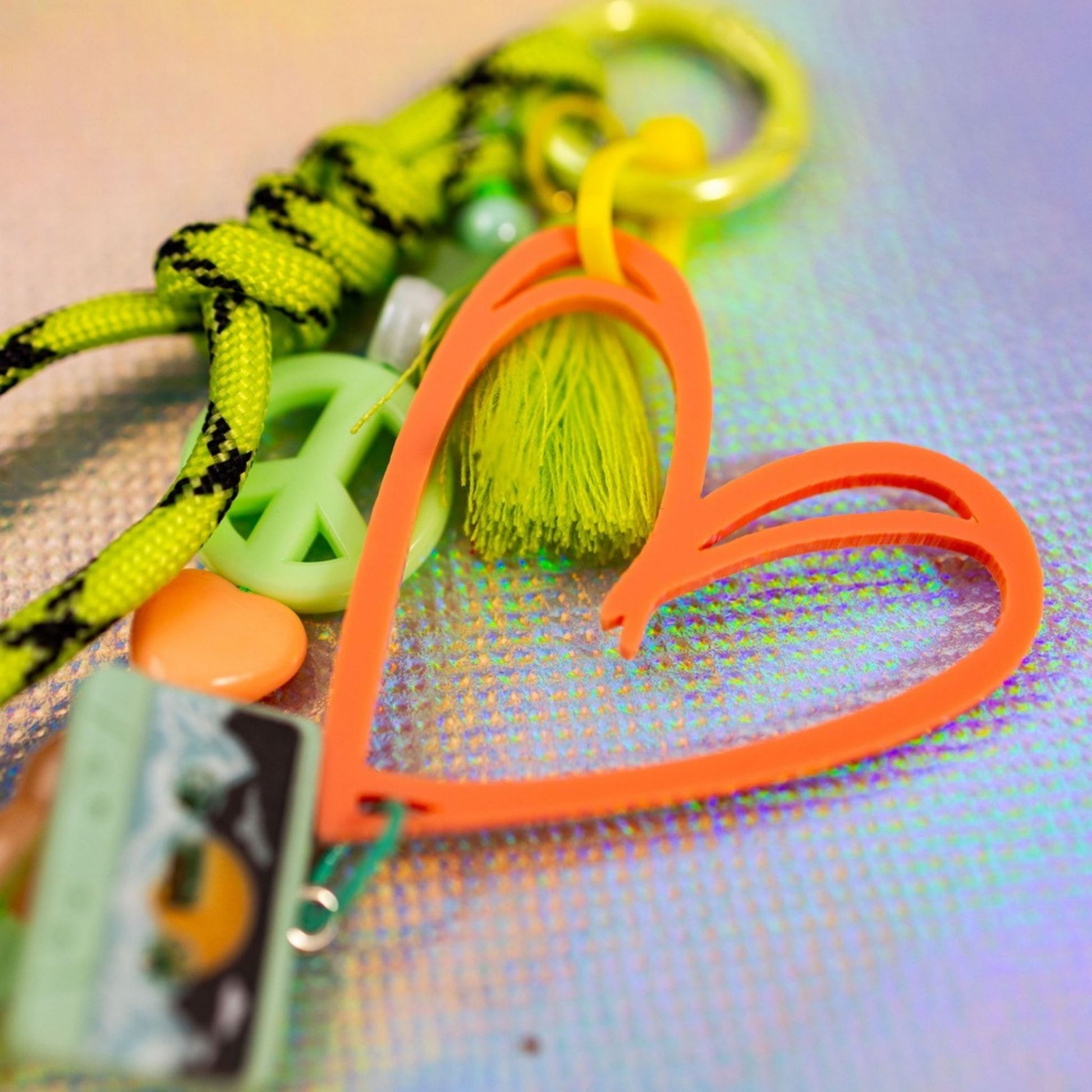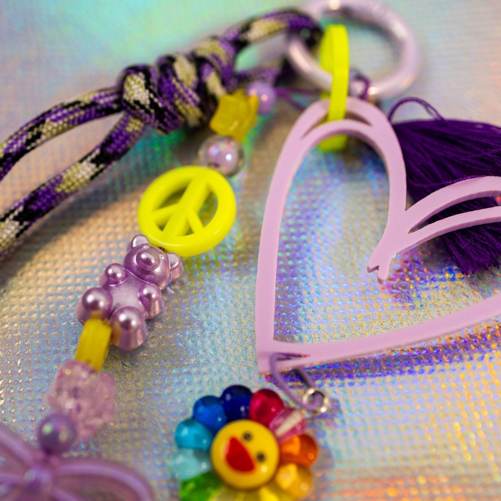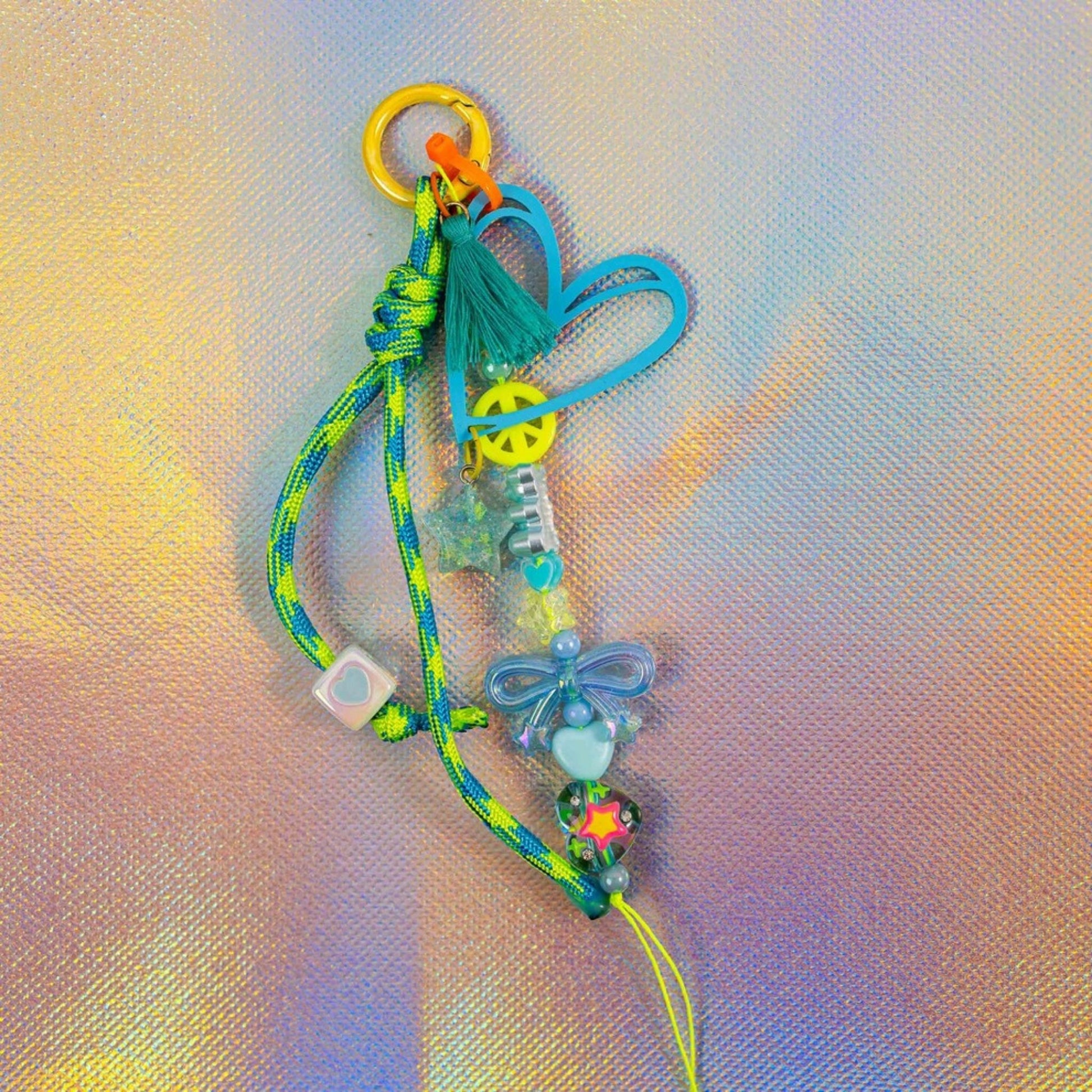 Close-up of sky blue graffiti heart key charm showing peace sign bead, star charm and tassel