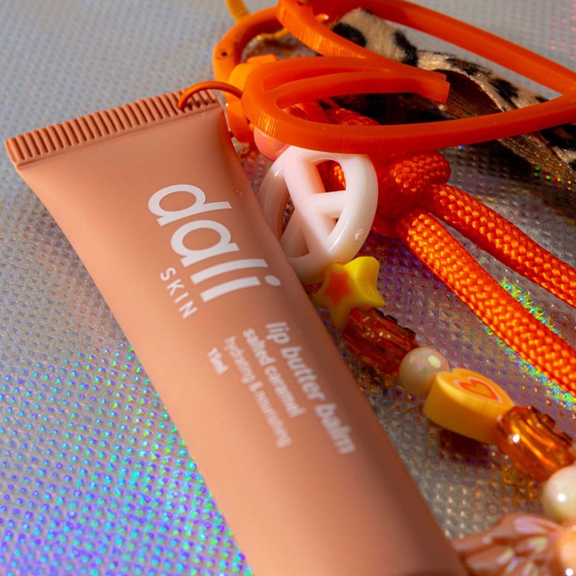 - A warm-toned Dali Skin Lip Butter Balm in a soft matte orange tube, delivering deep moisture and smooth lips