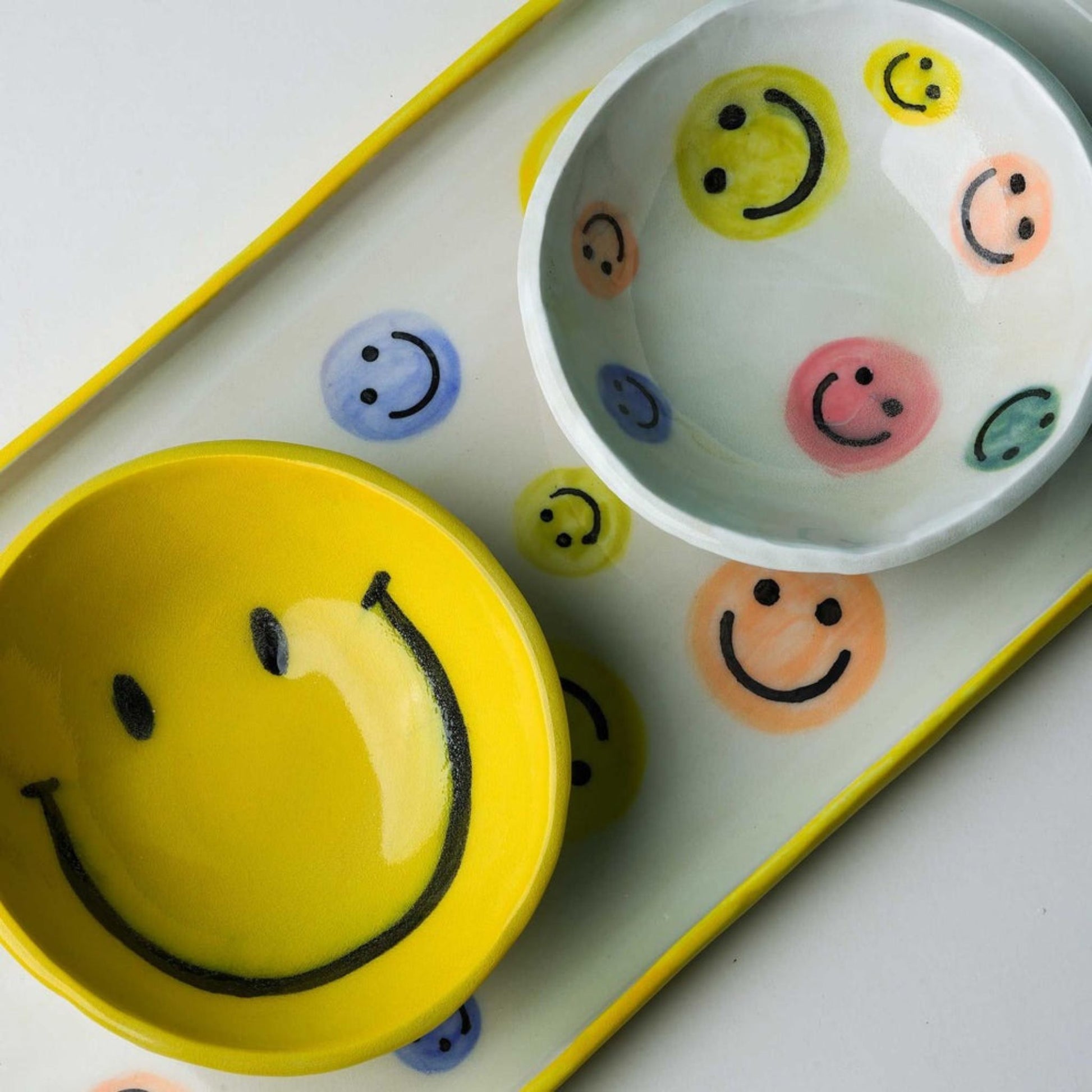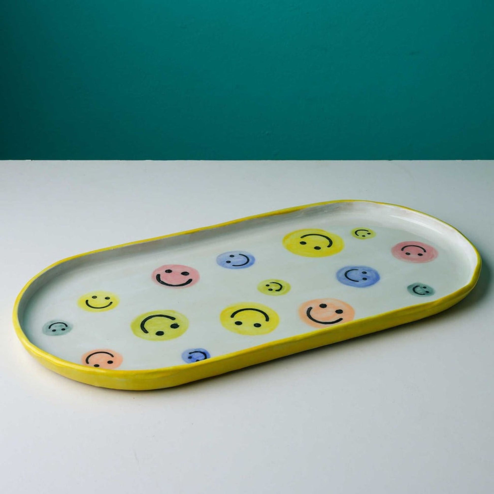 Serve up happiness with this handmade ceramic platter featuring playful smiley faces. Crafted in collaboration with Patricia Assaly, it’s perfect for sharing snacks, desserts, or adding a splash of cheerful charm to your table.