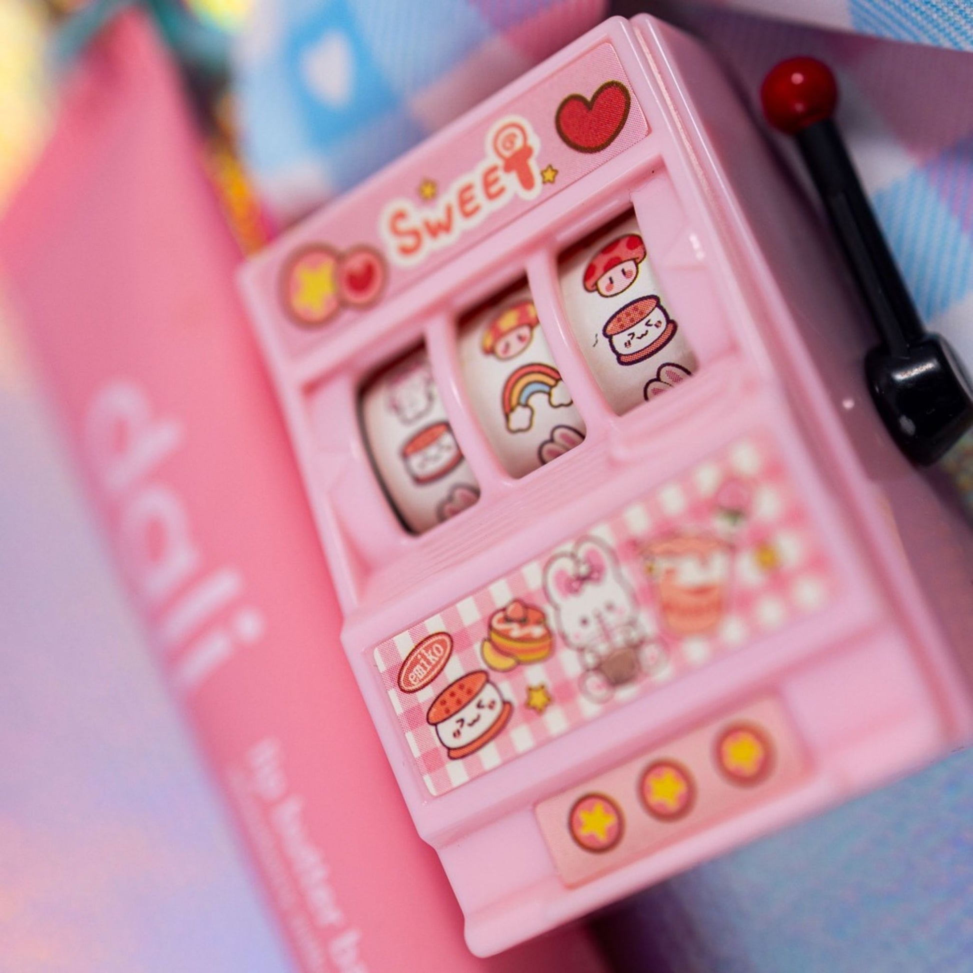 The main accessory is the "Jackpot" Mini Slot Machine Key Charm. This tiny, playable-style charm is bright pink, marked "SWEET," and features cute dessert symbols, giving it a playful, kawaii vibe. It's attached to a colorful, heart-patterned plaid bow strap for extra flair. Use it to decorate your keys, phone, or bag.