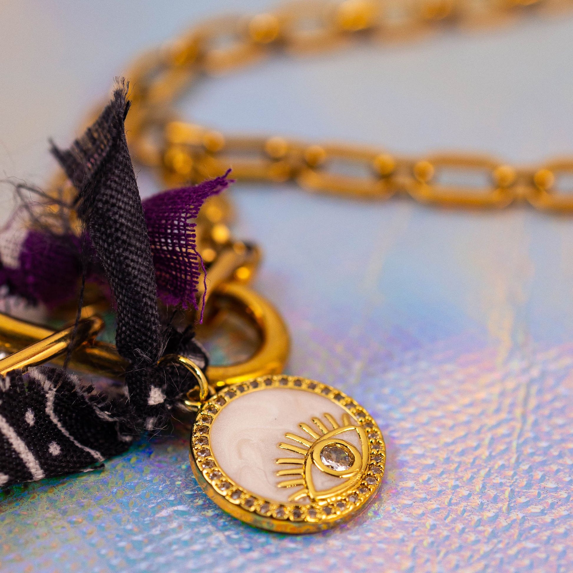 - Unique Detailing: The charms are secured by a large, distinctive gold-tone bail, accented with small, colorful ribbons that add a unique, street-style texture and contrast to the sleek gold links.