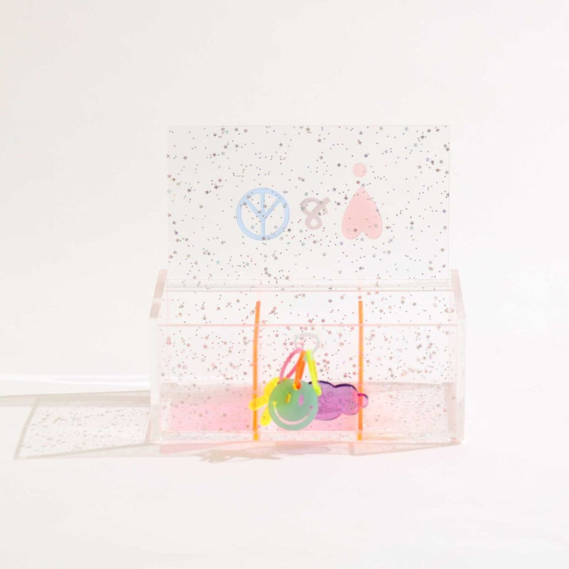 This handmade plexiglass box features three compartments and playful peace & love charms, perfect for storing jewelry, stationery, or everyday keepsakes. A colorful and creative piece crafted in collaboration with SMAC.