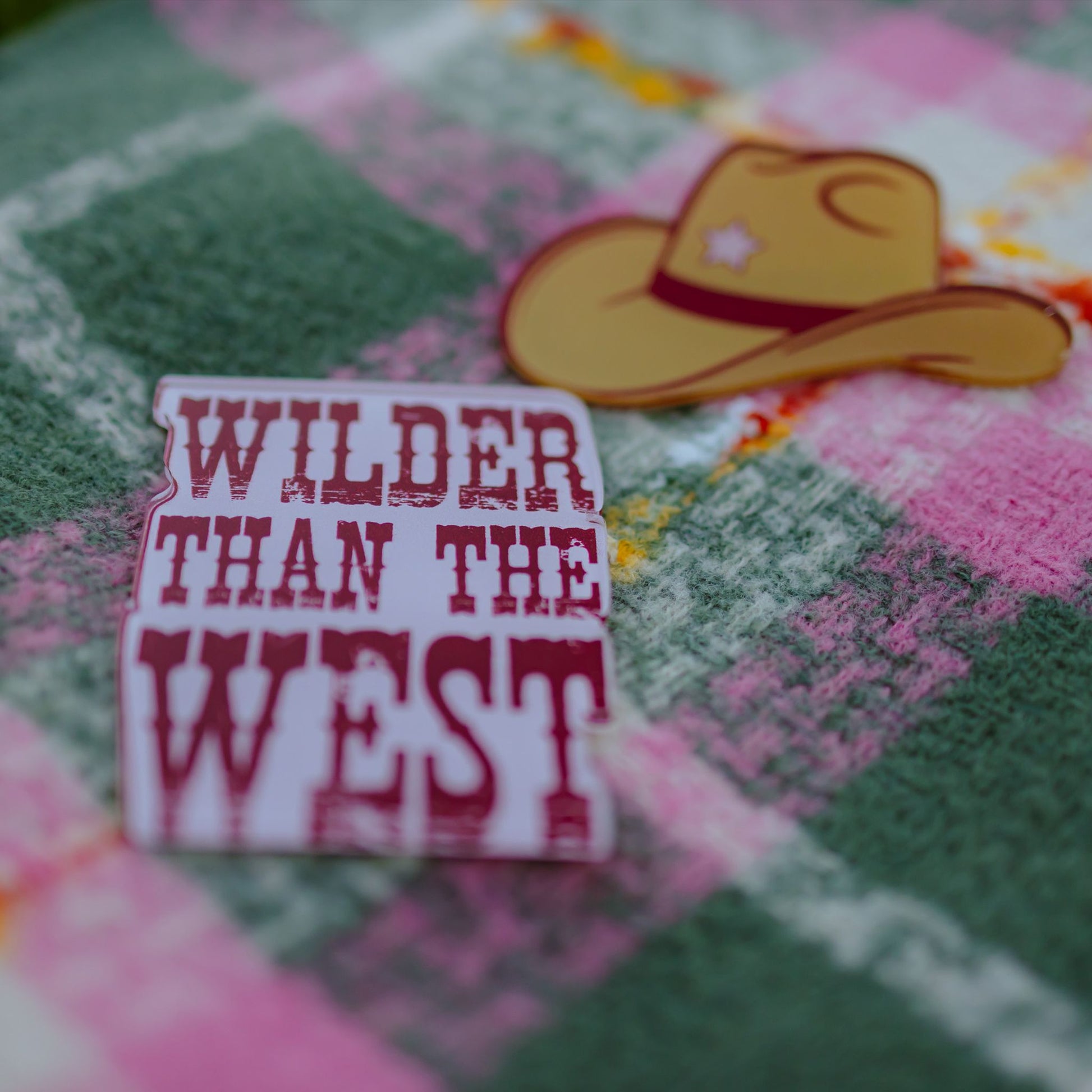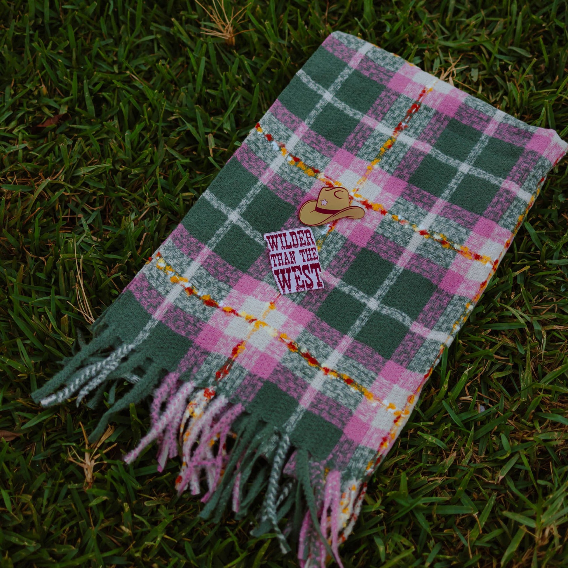 Stand out with fearless style in the Plaid Wilder Than The West Scarf in Cotton Candy & Galaxy Green. Featuring a bold plaid pattern with soft pastel pink and deep green tones, this cosy scarf is finished with playful western-inspired pins, including a cowboy hat and “Wilder Than The West” slogan badge. Perfect for statement winter looks, street styling, and bold gifting.