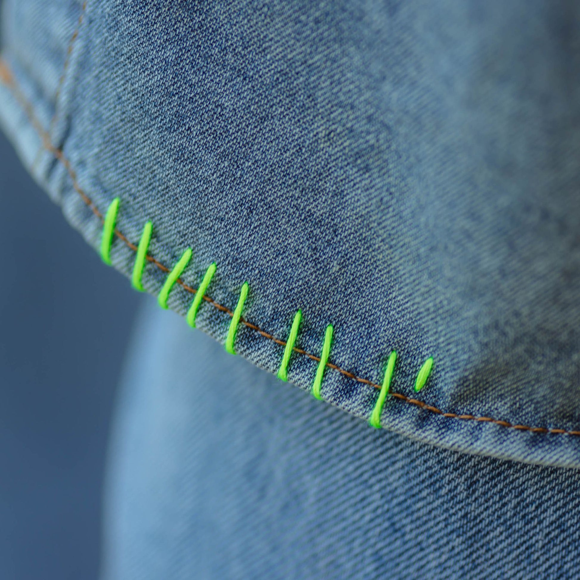 - Custom Neon Accents: Contrast neon hand-stitching (like the lime green on the hem and collar or the orange on the cuff) adds a unique, handcrafted, Indie, and Y2K-inspired touch.