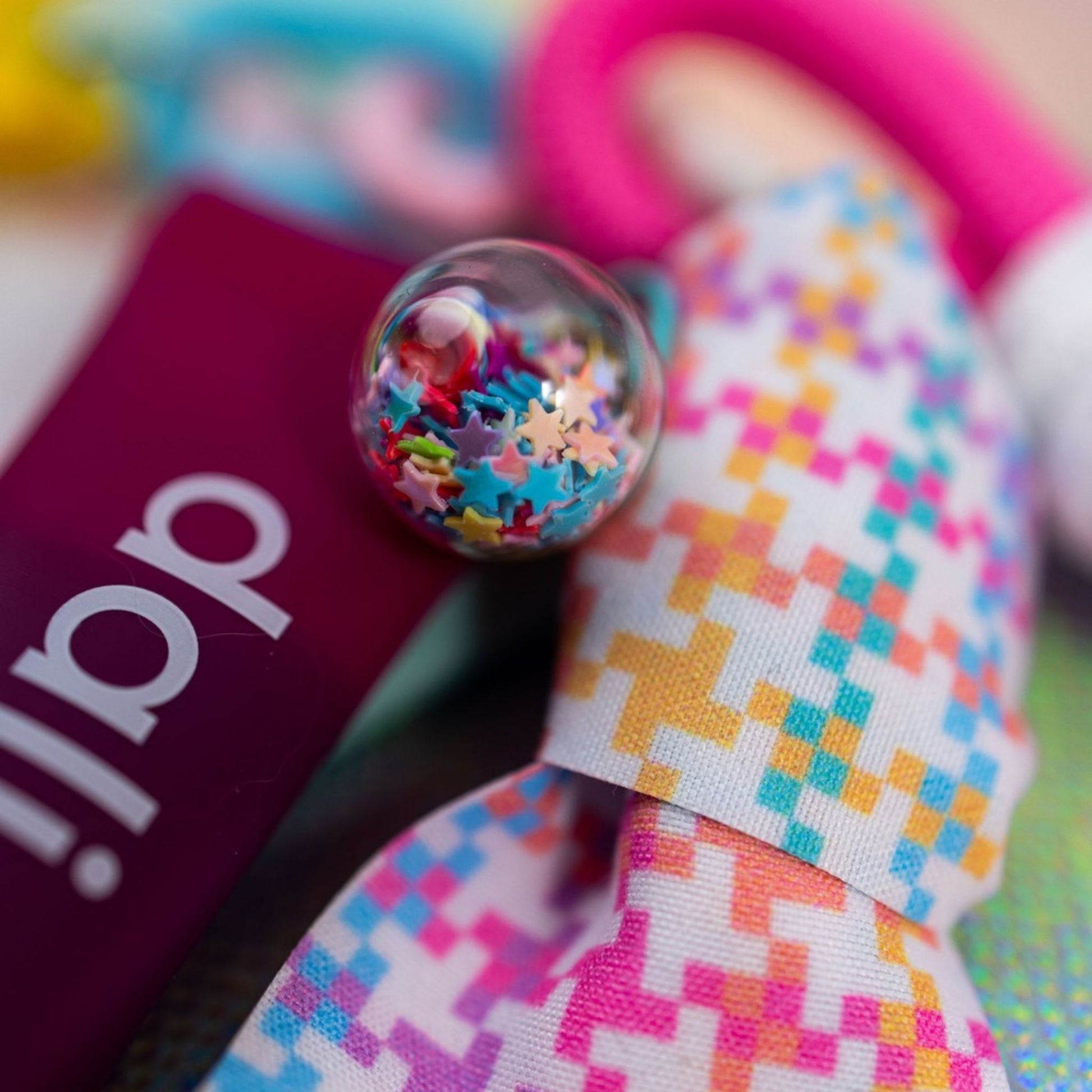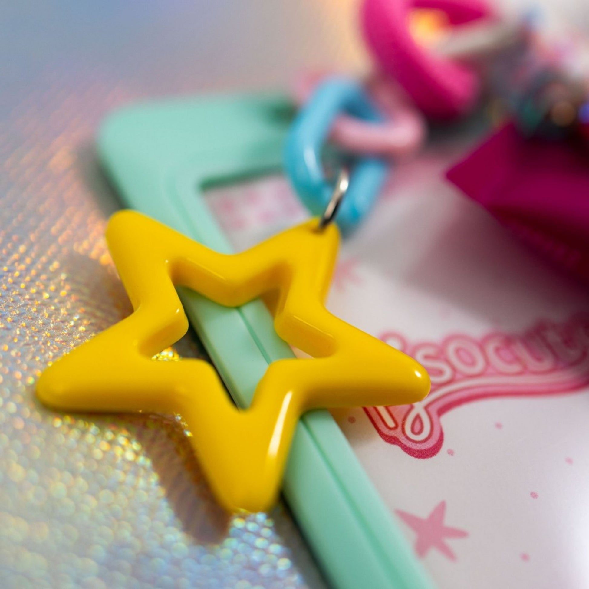 Capture your favorite memories or display the cute insert with this vibrant, nostalgic bundle! The star of the set is the playful Mini Photo Frame Key Charm. It is accented with a bright yellow star charm and a chunky pink and white paracord loop. The colorful, patterned ribbon and mini confetti ball add extra flair, making it an attention-grabbing piece for your backpack, lanyard, or keys.