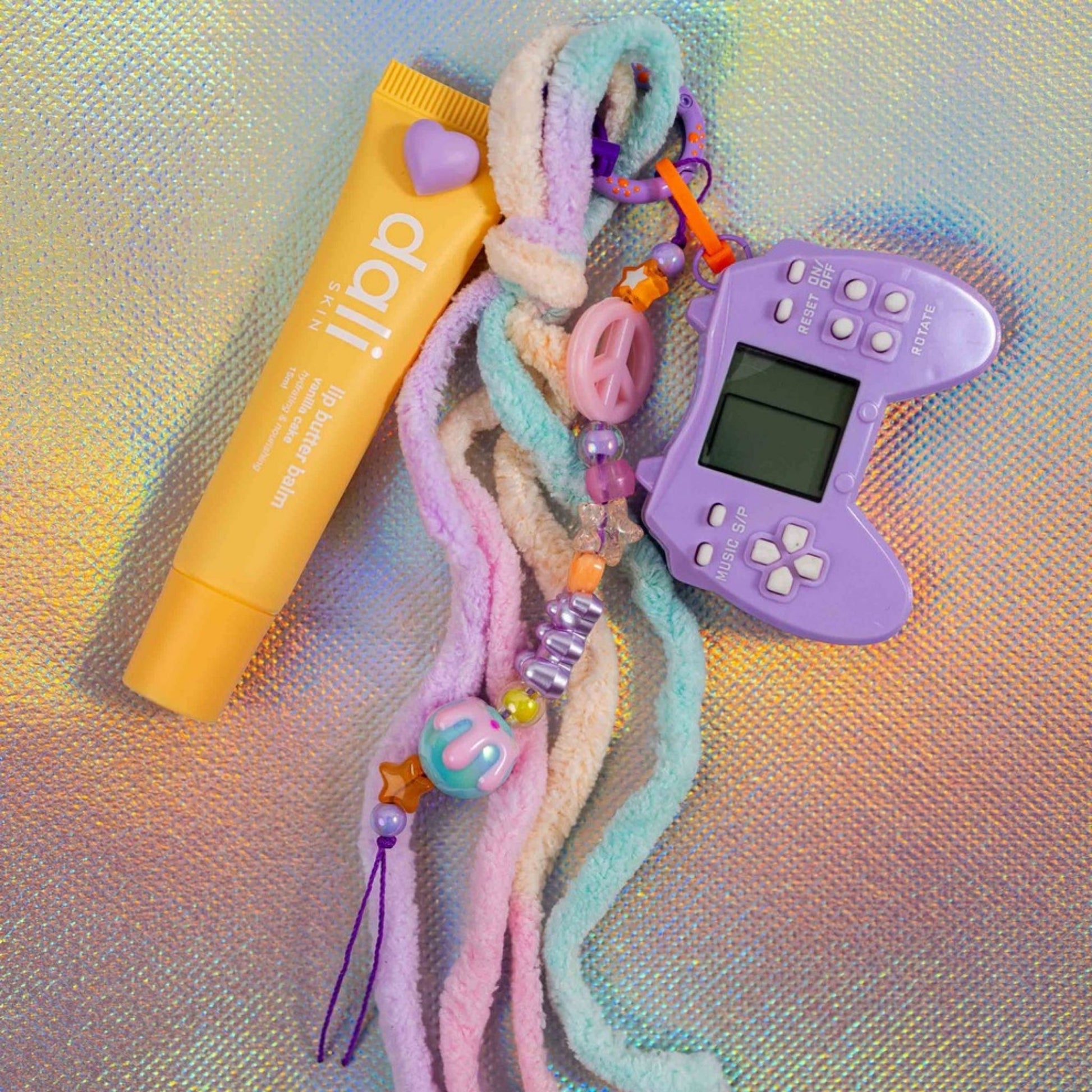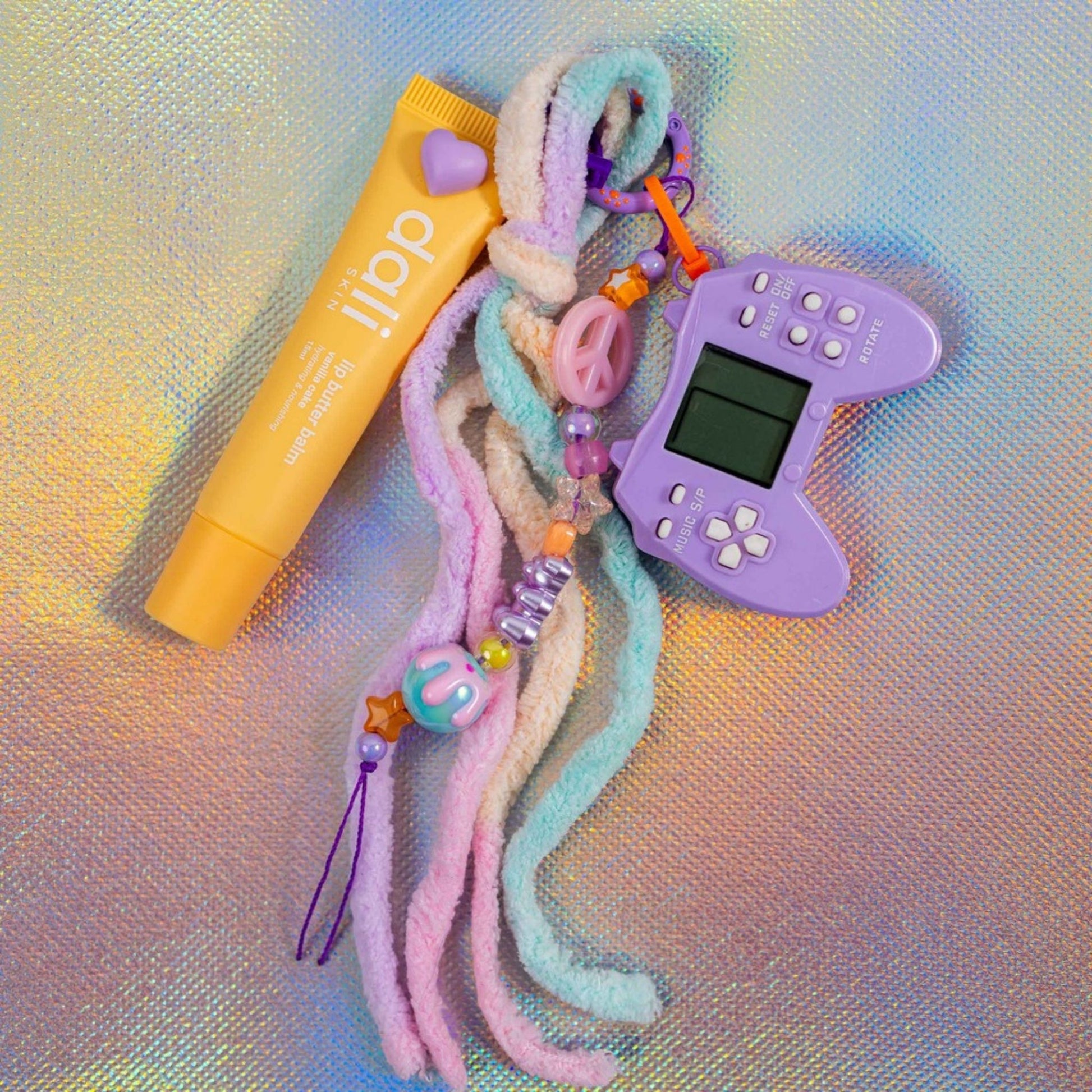 Get ready to play with this charming, nostalgic bundle! This set is perfect for retro gamers and fans of the current Y2K aesthetic. The centerpiece is the Purple Retro Handheld Gaming Console Key Charm, featuring a miniature screen and buttons. The charm is suspended from a fun, multi-colored pastel chenille braid strap, complete with peace signs, star beads, and other playful embellishments.