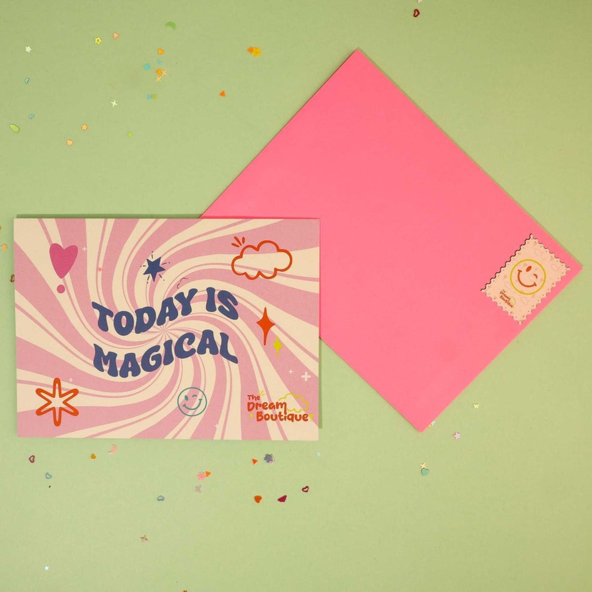 Spread smiles with this whimsical “Today Is Magical” card. Fun swirls, playful doodles, and it comes with a matching pink envelope and smiley stamp, perfect for birthdays, thank you notes, or everyday magic.